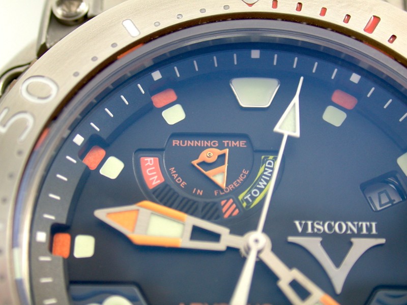 The dial has some bold styling, with the flared V for Visconti at 3 o’clcock, a mix of markers with Arabic 4 and 8 along with luminous block squares, and flared hands. There is a power reserve display at 10 o’c,cock, and date at 2.