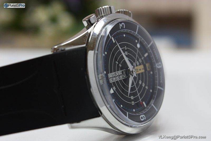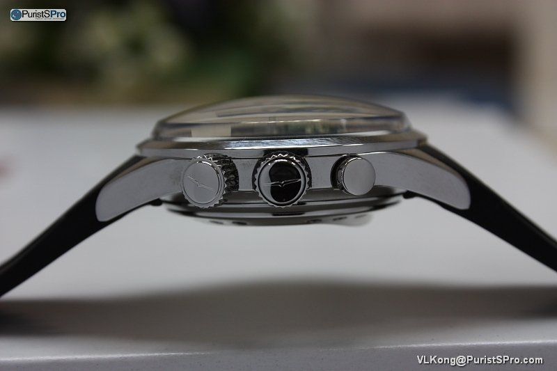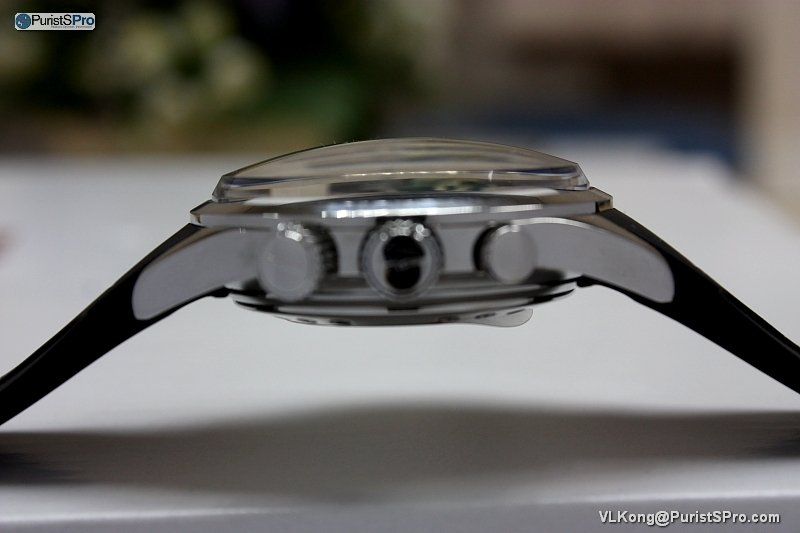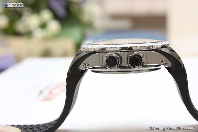 Side profile....the alarm crown is marked differerently (the pusher is protected by the screw-down lock).