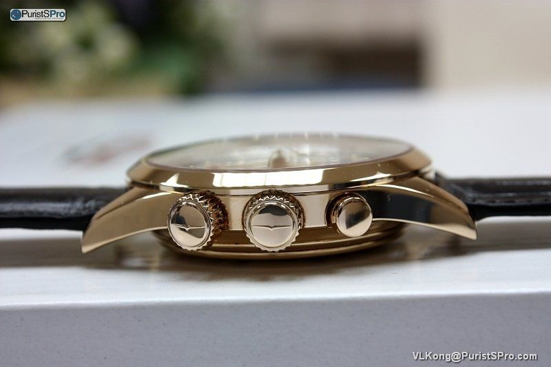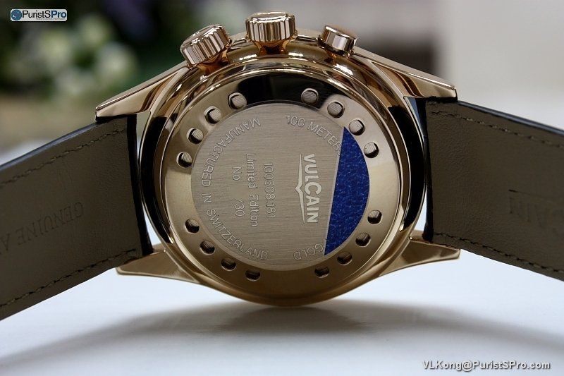Signed crowns with Vulcain logos. The gold case is 42 mm diameter.