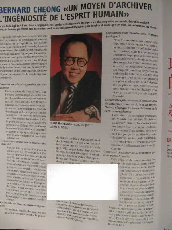 The major watchmakers know his smile, his patience, kindness and above all, his encyclopedic knowledge. Epicurean, a music lover and musician (he plays several instruments), Bernard Cheong, a doctor of 48 years in Singapore, is one of the collectors watch the most respected in the world. He had never worked in the industry. His knowledge anthology in the field, its history, models, brands and technology watch goes beyond that of many professionals.