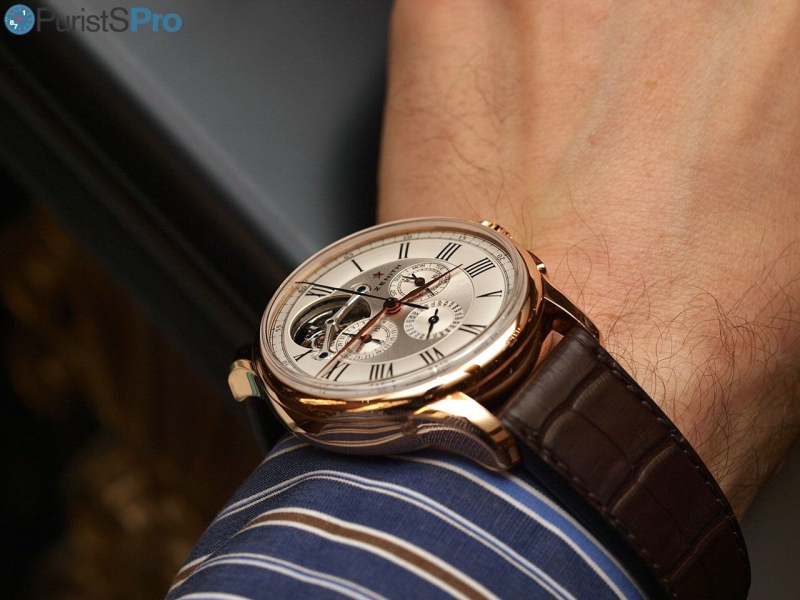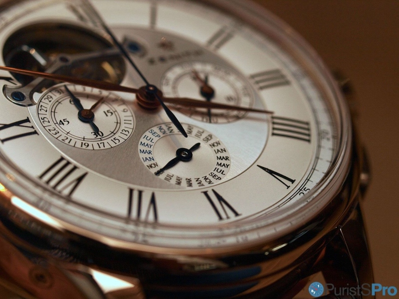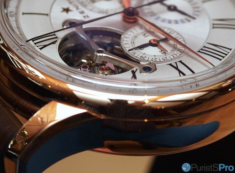 After I collected my lower jaw from the table and gave myself a slap in the face I my physical parameters were again set into watch-drroling mode. Its a complicated watch with a tourbillon and a perpetual calendar, elegantly integrated into the subdials of the automatic chronograph:
