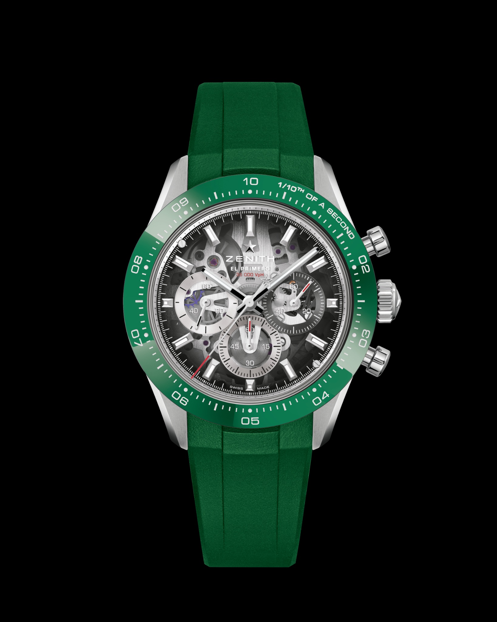 Today, the CHRONOMASTER Sport continues this lineage with the El Primero 3600, regulated at 5Hz. This elevated frequency enables the precise measurement of 1/10th of a second as a direct mechanical consequence of its architecture. Unlike conventional chronographs, where the central chronograph seconds hand completes one rotation per minute, the El Primero 3600 drives a hand that circles the dial every 10 seconds. Each increment corresponds precisely to one tenth of a second and is read directly against the 10-second graduated ceramic bezel, making high-frequency performance both measurable and visible. This technical approach has consistently defined ZENITH's chronographs for more than half a century.