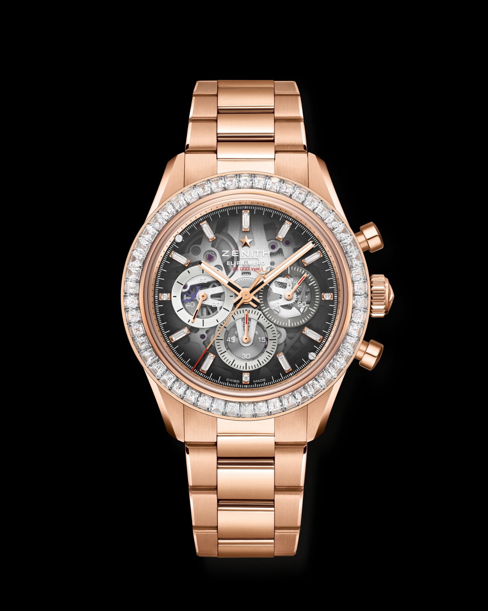 Completing the collection is an exclusive limited edition of 10 pieces in rose gold, matched with a gold bracelet and crowned by a bezel set with 50 baguette-cut diamonds.
