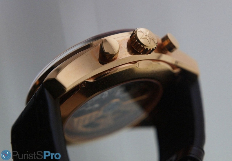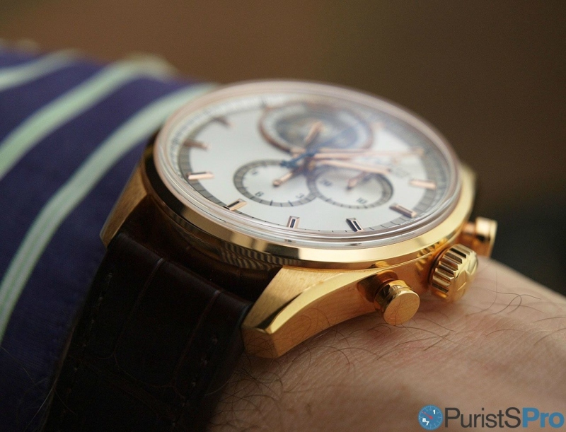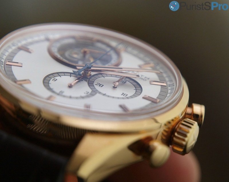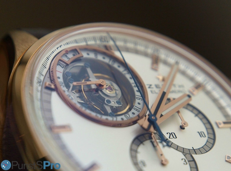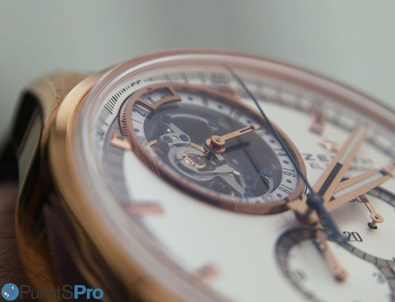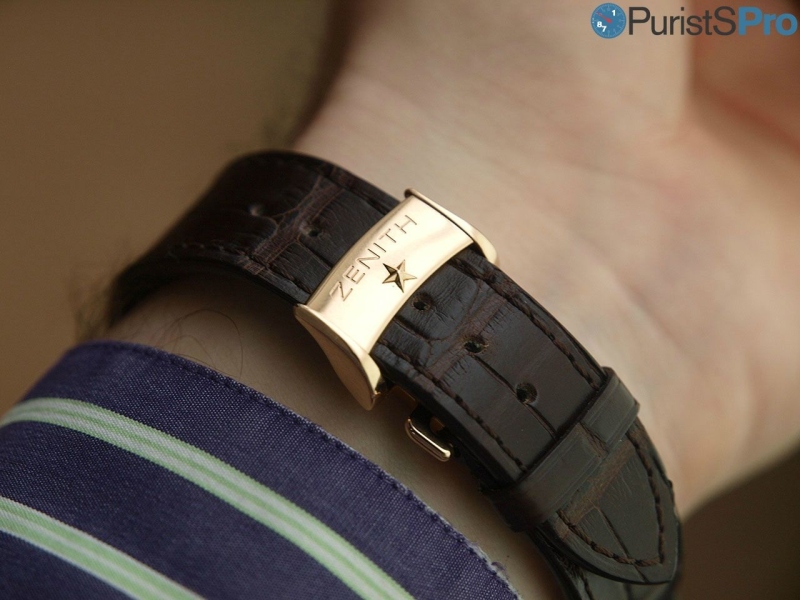 The case (here: red gold) is a typical Zenith case with the signature rimmed pushers and a subtle but quite effective little detail, the small opening below the crown facilitating its operation: