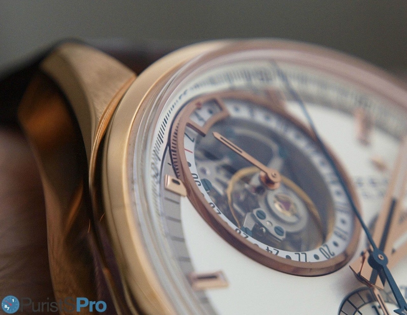 One very neat feature sets it apart from all other similar compilations on the market: the position of the date, which is indicated on a chapter ring surrounding the tourbillon window.