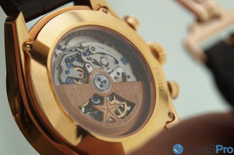 Below a sapphire crystal one can admire the movement (Calibre El Primero 4035 D: 381 components, 35 jewels and 36,000 VpH), which from this perspective differs not all that much from a conventional El Primero.