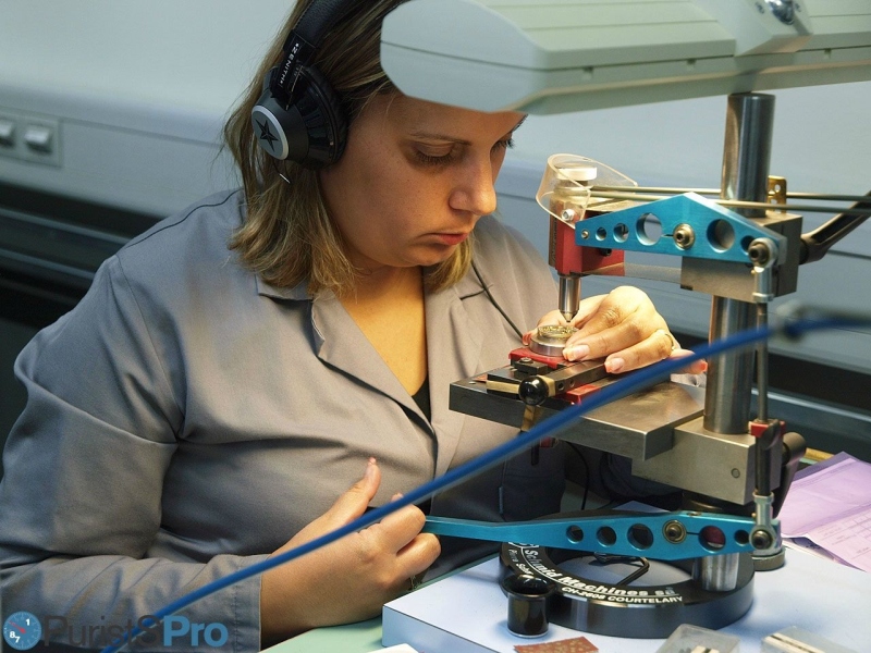 ... another in a much more elaborate and - importantly! - hand-applied finishing. This is what the higher complications differentiates from the more conventional ones at Zenith: Finishings like perlage are entirely hand-applied vs. machine-made. Here we could take a glimpse at the finishing department (perlage):