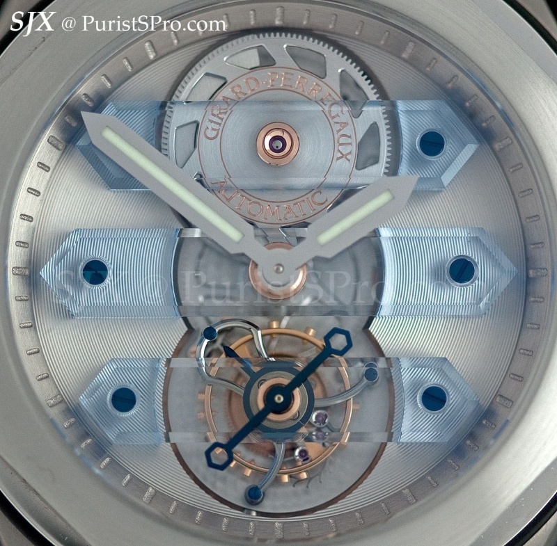 Several years ago GP unveiled the titanium case Laureato tourbillon with sapphire bridges. This year instead of sapphire, the bridges are spinel, hence the bluish tint. Spinel is a crystal and in this case I believe it’s grown artificially then machined into the bridges, just like sapphire.