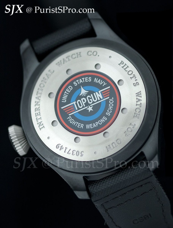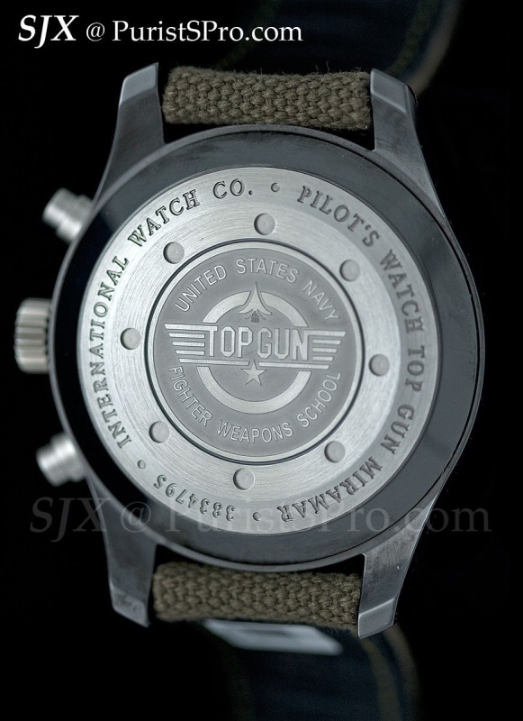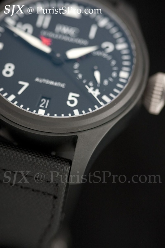 Now on to the Top Gun watches. As before the cases are all in matte black ceramic, but IWC has wisely got rid of the Top Gun logo on the case side. The entry level model is the Pilot’s Watch Chronograph Top Gun with a 46 mm ceramic case and the IWC cal. 89365 chronograph movement. The dial design doesn’t sit well with me, the sub-dials appear too small.