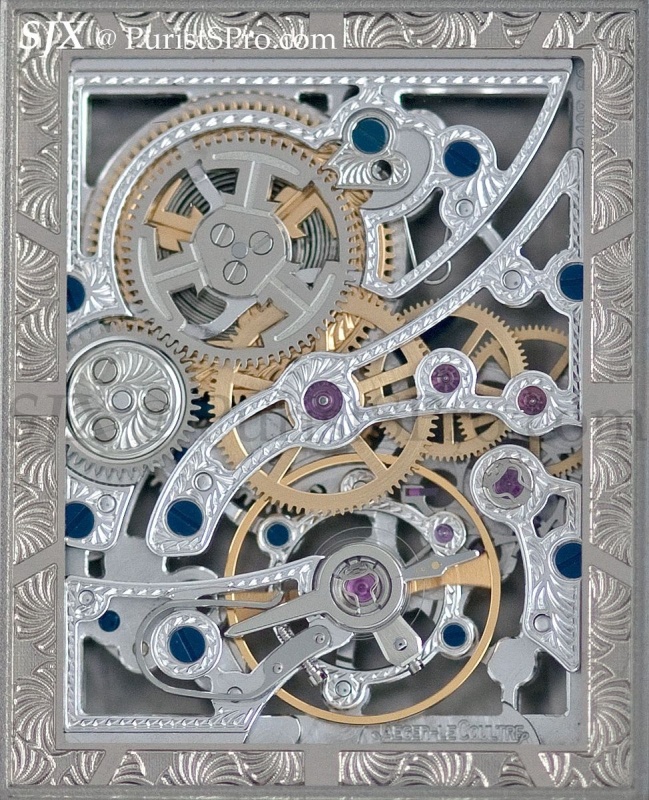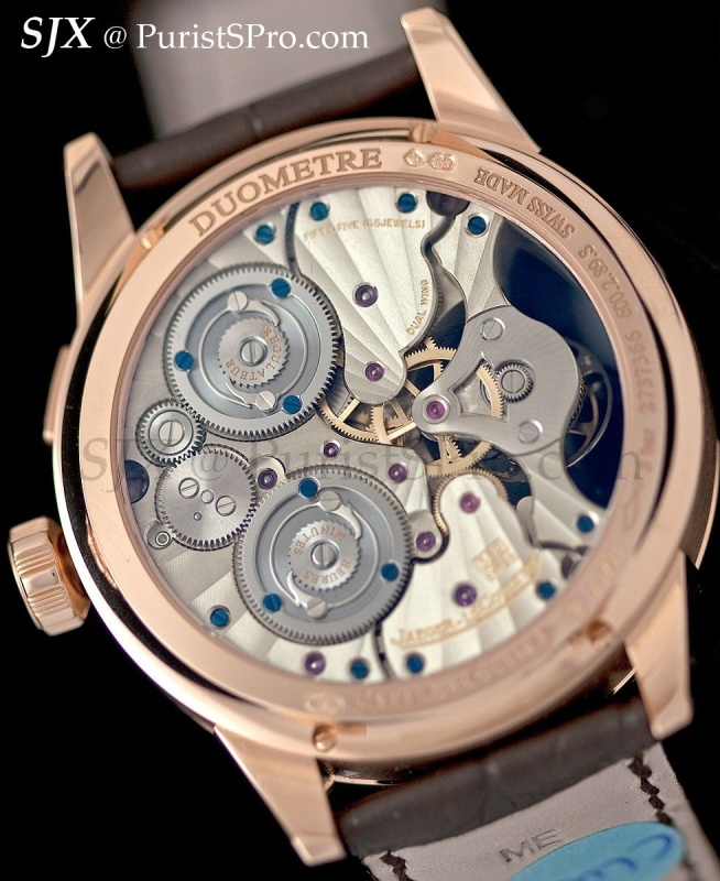 JLC explains the ‘dual wing’ concept of the Duometre – two barrels and gear trains – allows for the seconds reset function since the tourbillon regulator has its own gear train. But since this is a seconds reset, I wonder if twin gear trains are needed to achieve this. The same chronometric performance should be achievable with a single gear train, just like a chronograph with a vertical clutch.