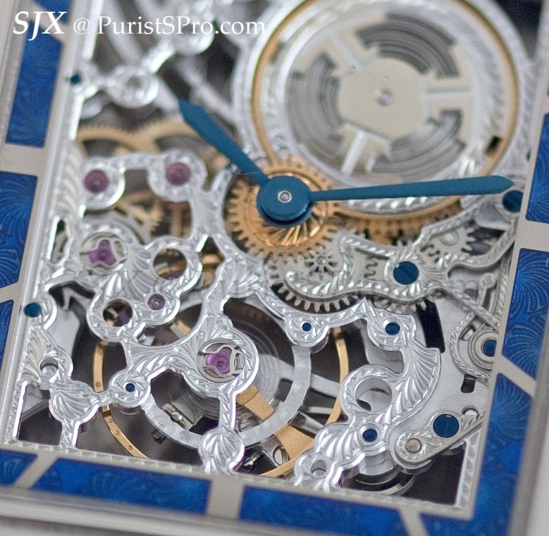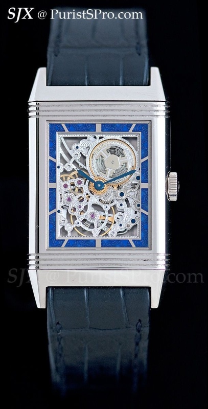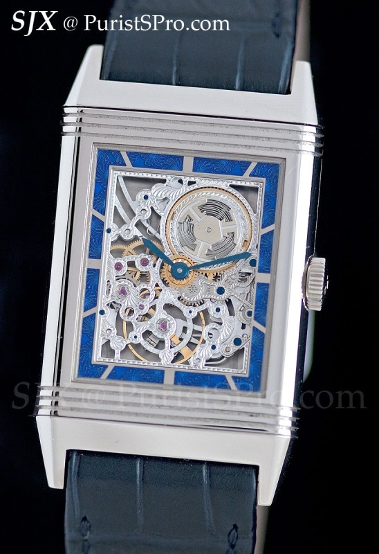 The first is the Grande Reverso Ultra Thin Skeleton. This is a skeleton Reverso in a white gold case with a blue enamel border around the movement on the front. Unusually for a skeleton watch of today, it is skeletonised in the traditional manner, meaning elaborate engraving and decoration, reminiscent of the Reverso Art Deco of several years ago. This is a limited edition of 50 pieces.