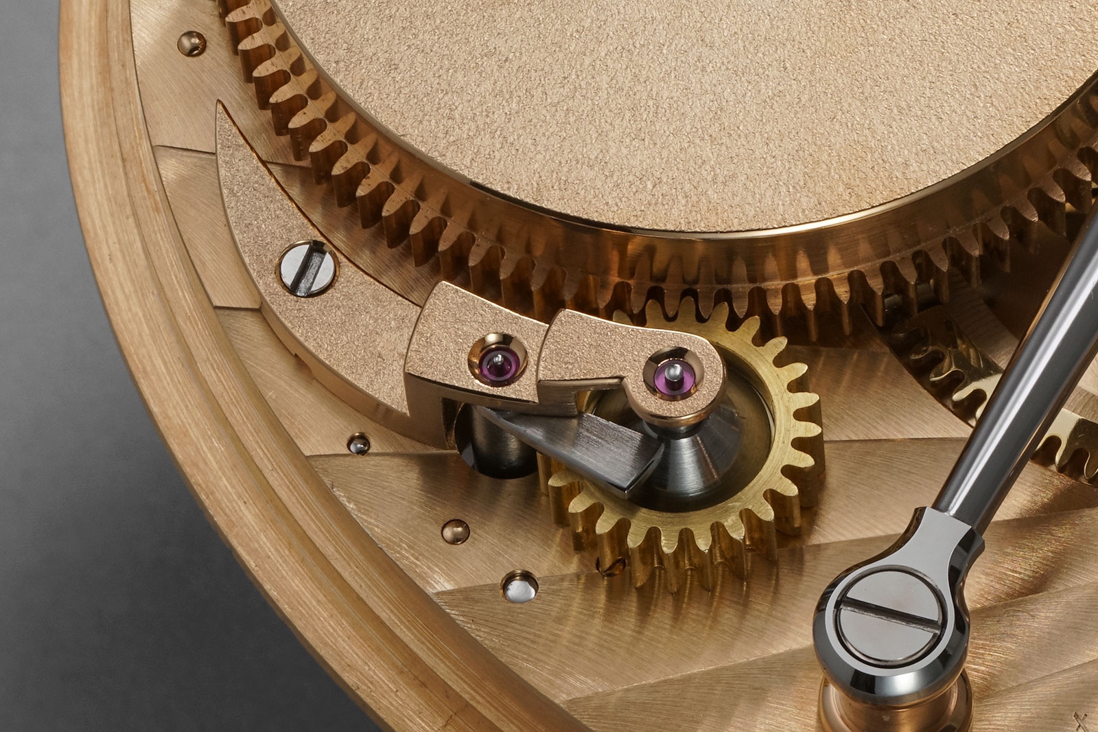 Upper section: large third wheel of the gear train and mounting holes of the lantern bearing of flying tourbillon