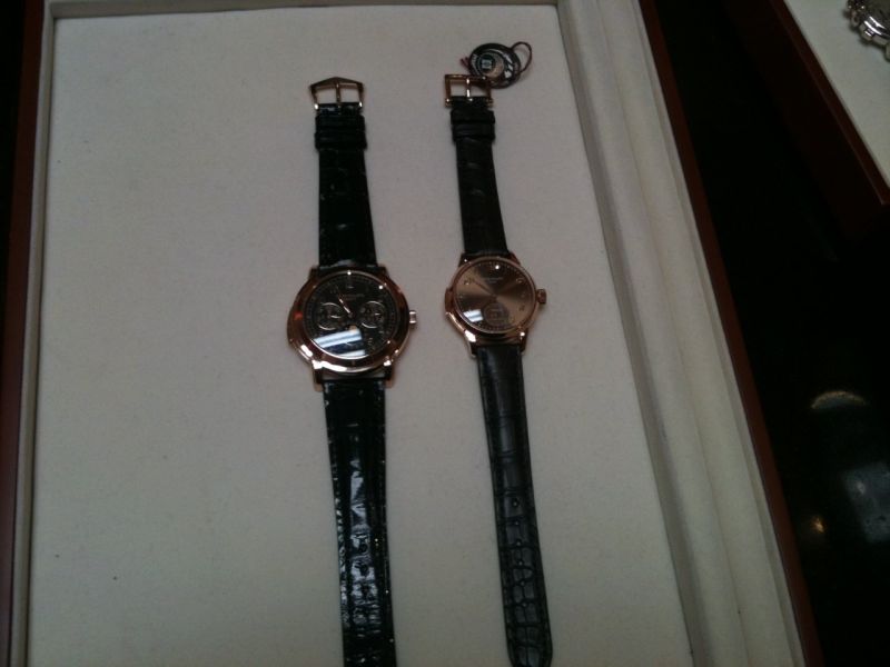 I took a drive over to my AD today to see two outstanding pieces he had just received for clients of his. This was my first chance to see and hear Patek repeaters in person. A 5074 and 3939, both in rose gold - absolutely breathtaking! I was only in a position to take a couple of crappy pictures with my phone. I also video'd both of them to record their chimes, but I'm not succeeding at getting the video uploaded.
