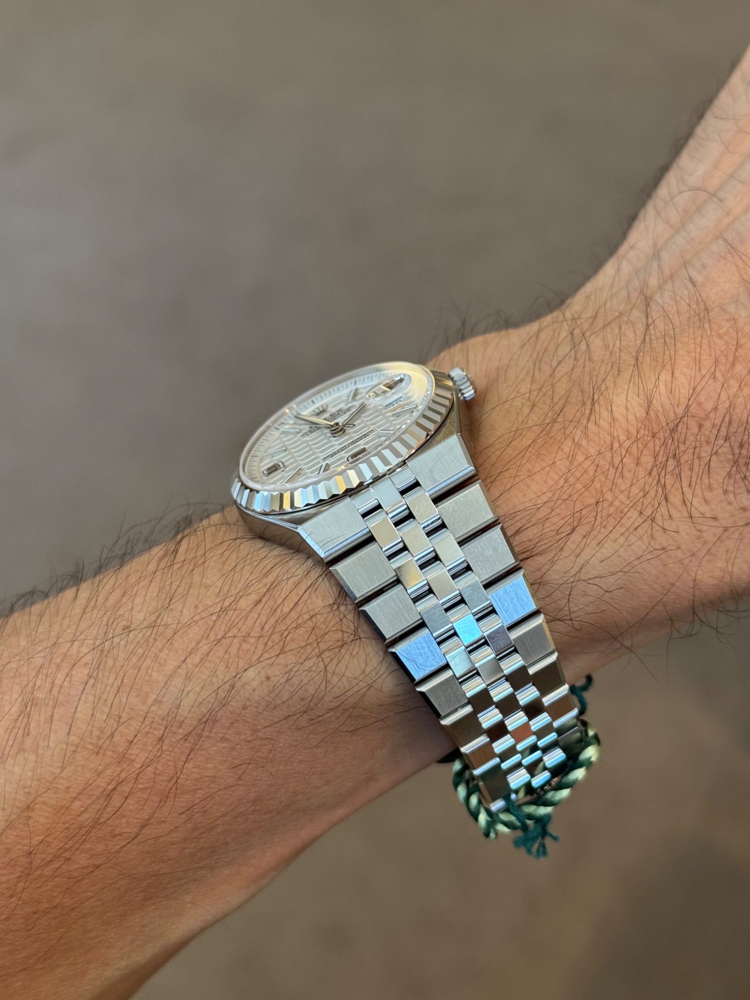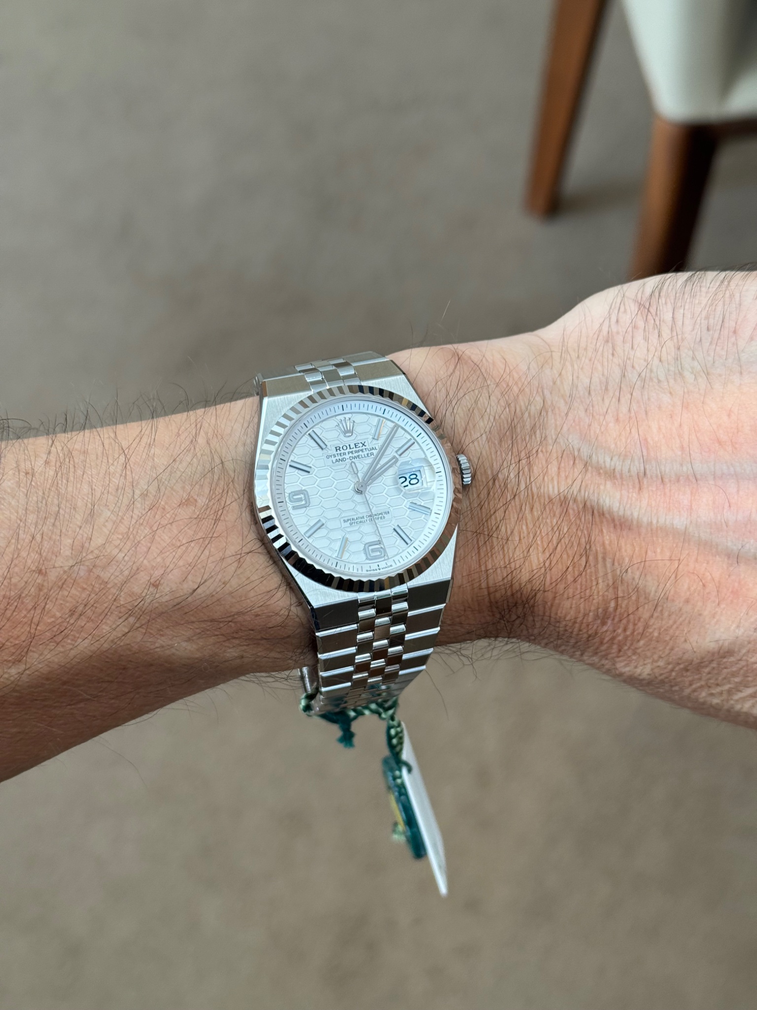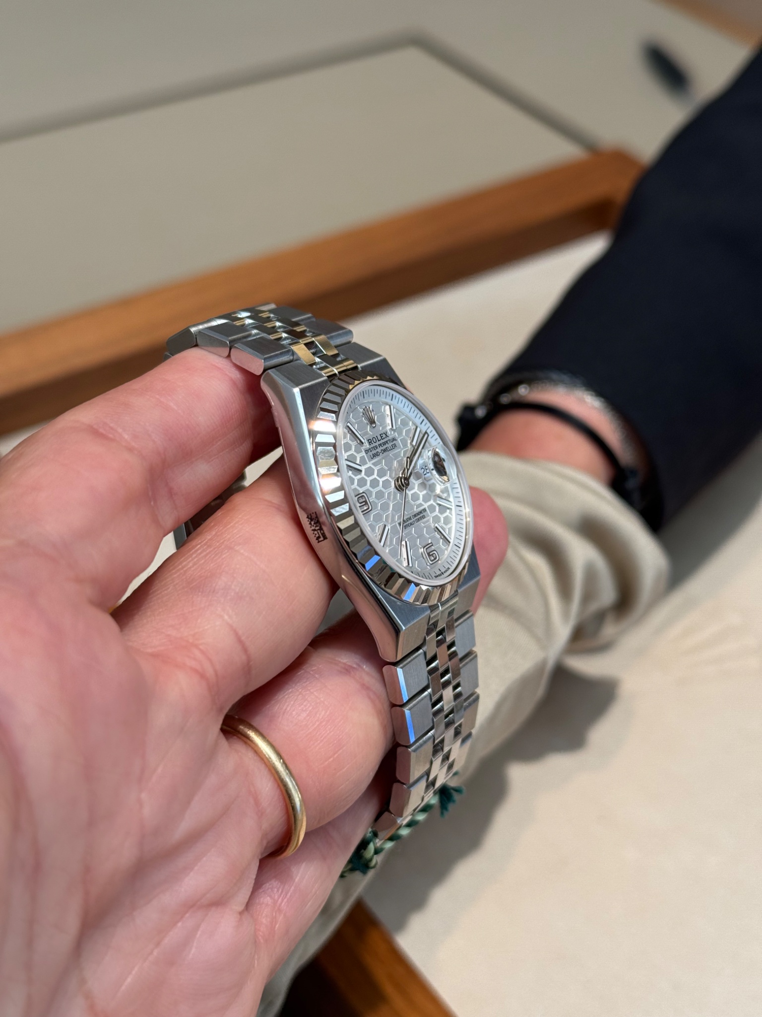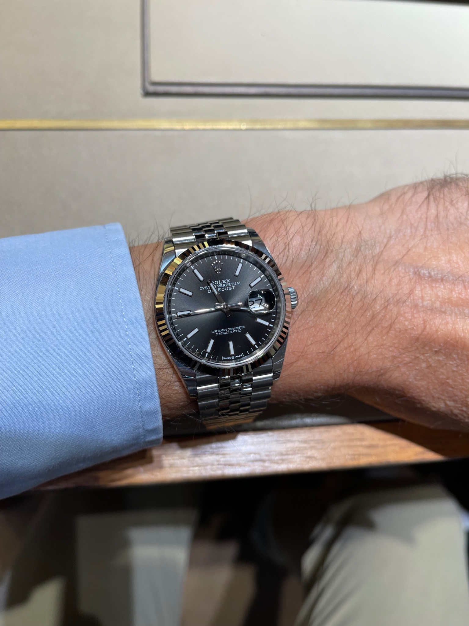 I asked to try on the 36 mm ref. 127234 in oystersteel & white gold ("White Rolesor", as Rolex calls this combination of metals).