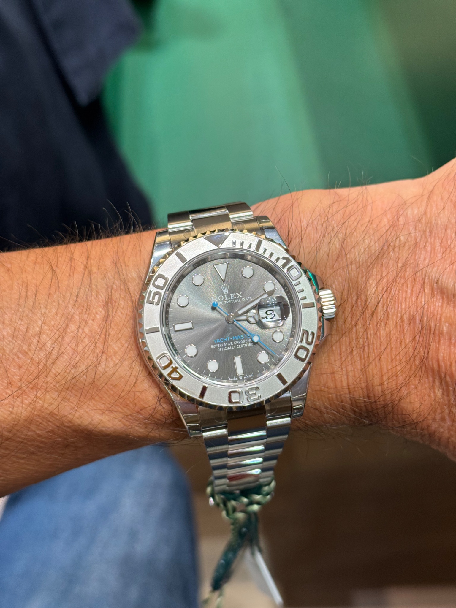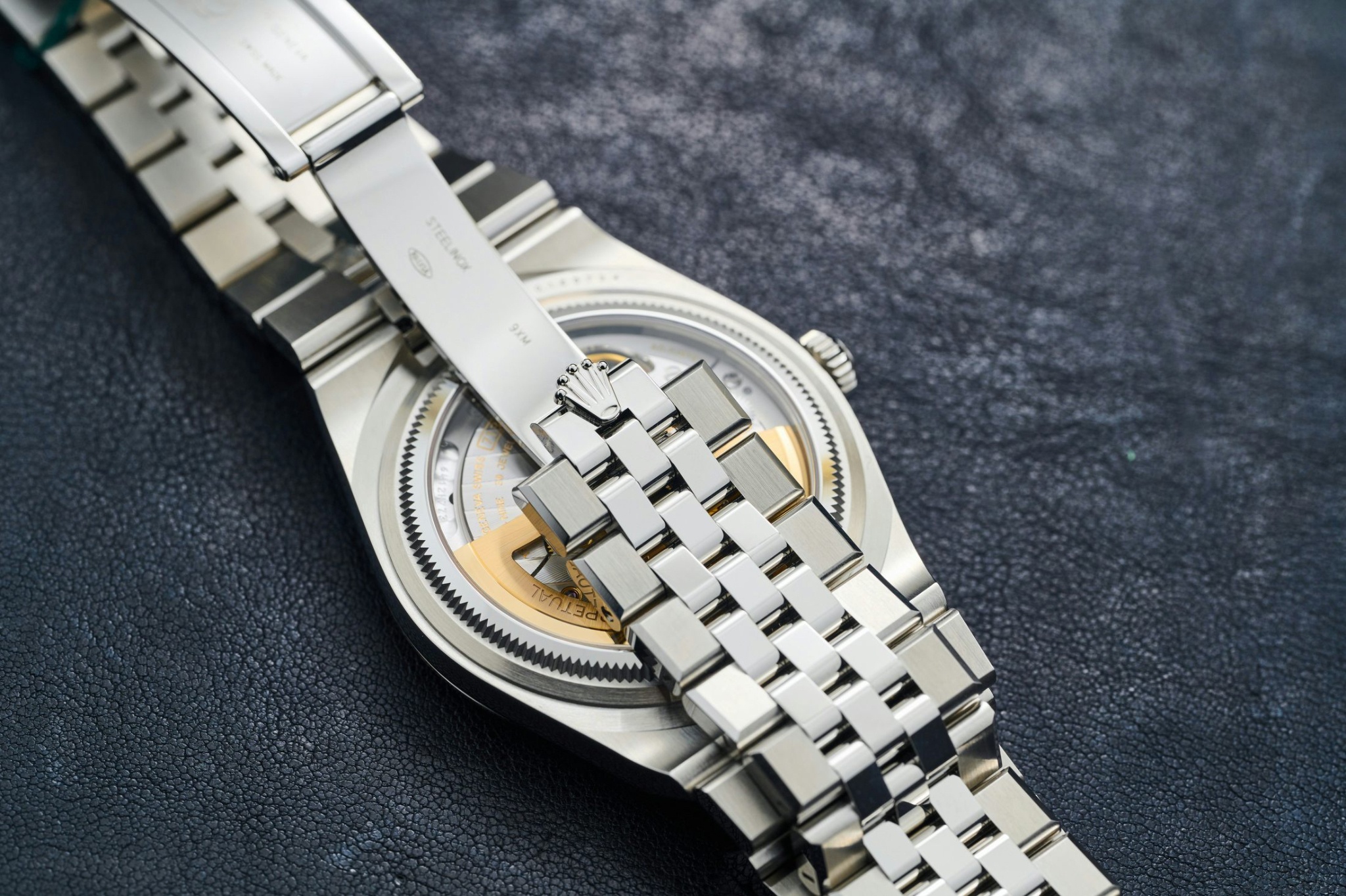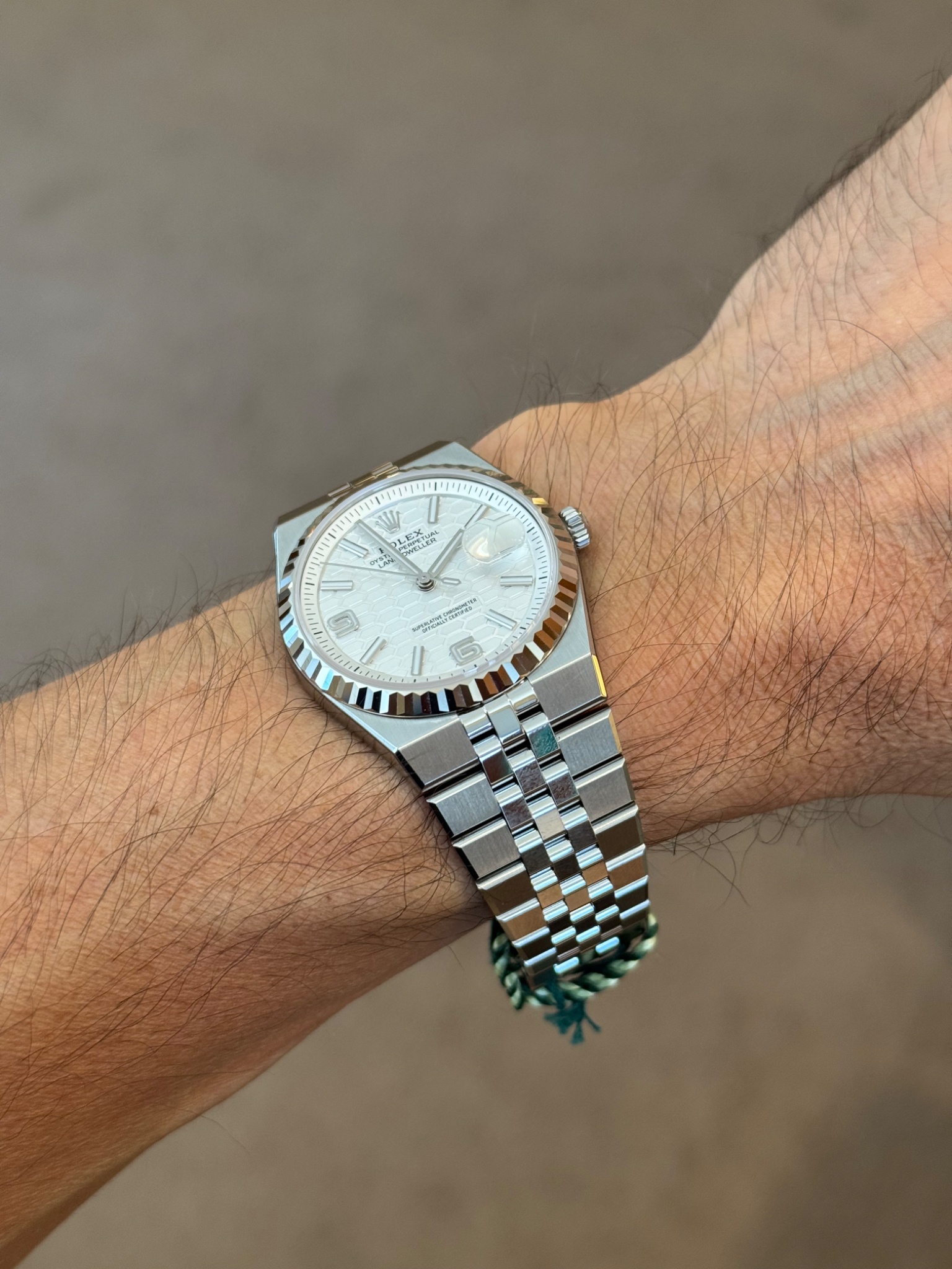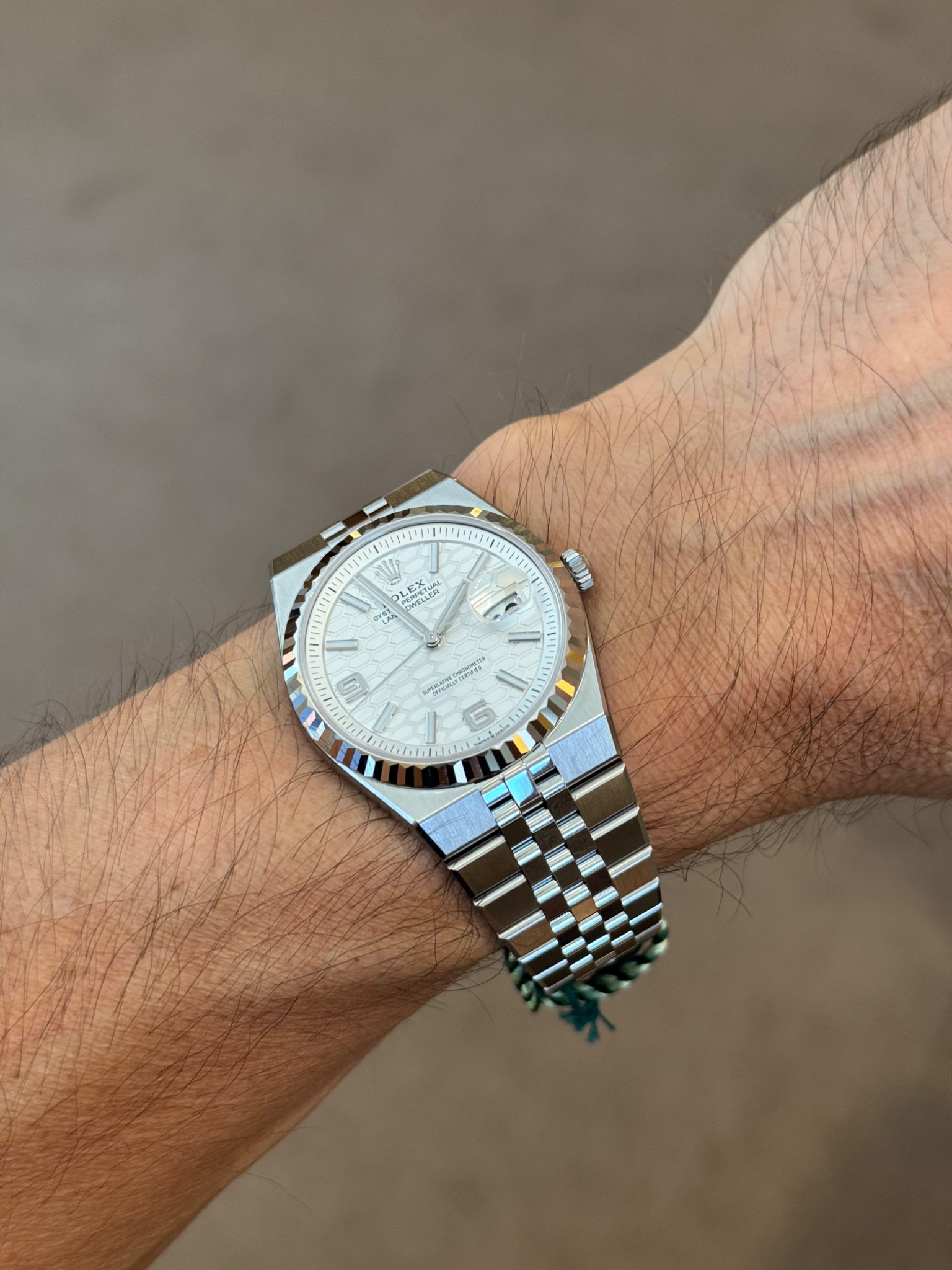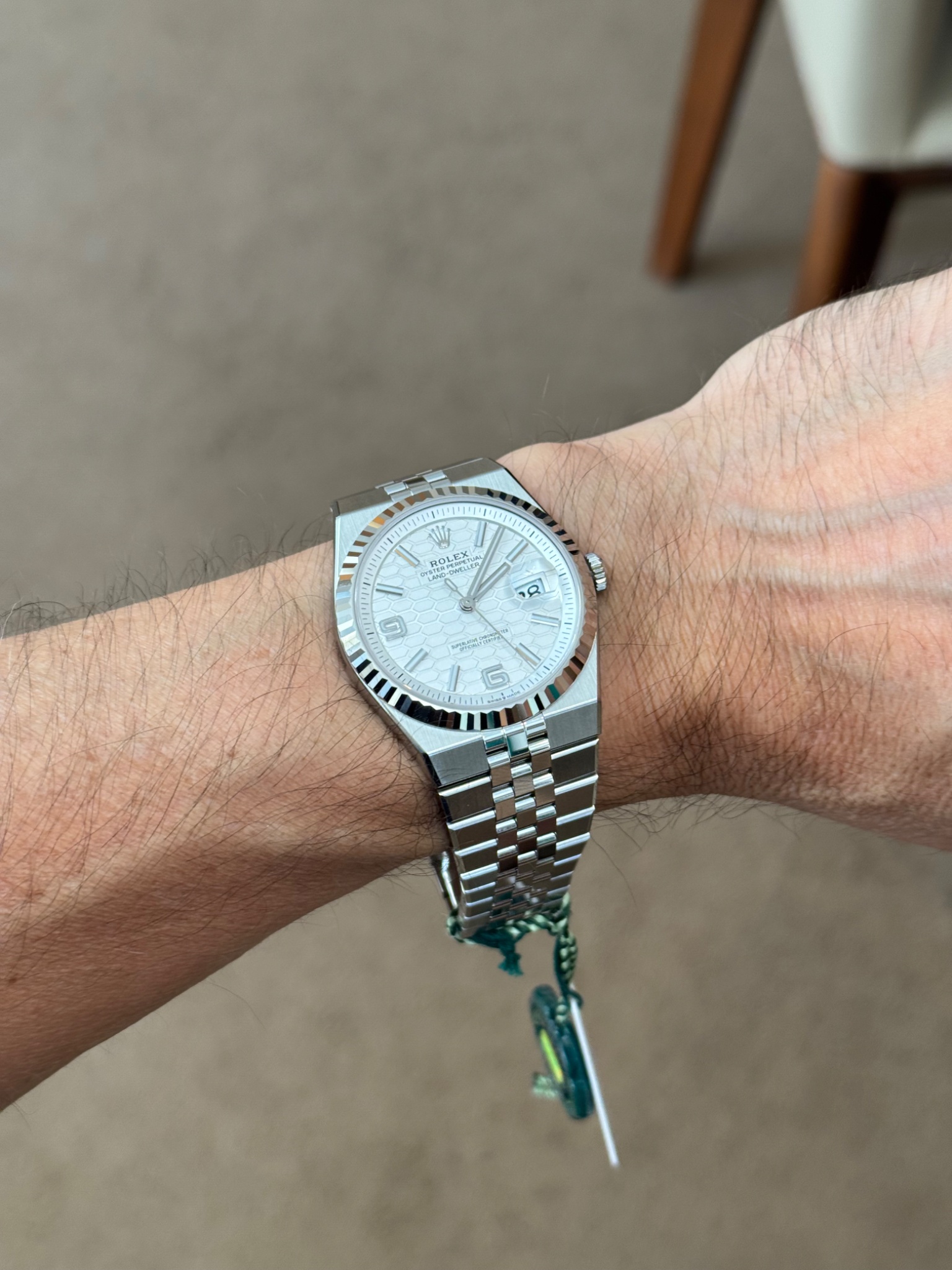 I asked to try on the 36 mm ref. 127234 in oystersteel & white gold ("White Rolesor", as Rolex calls this combination of metals).