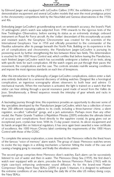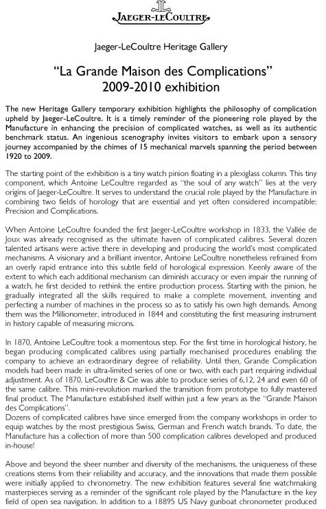 To make it short, JLC organizes an exhibition, from now till 2010 ( term not precised ) about their Treasures.