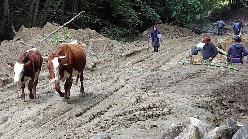 Leaving behind the tourism magnet, we find ourselves on one of the worst pieces of country roads encountered so far. Even the most courageous Dacia drivers only rarely dared to surpass walking speed, the concrete plates seemed to have been used in a large earthquake simulation. “Drum bun”, “good trip”, is the wish written on big signs when leaving any village in Romania. Roads like this give a deeper meaning to it. It is clear that since the days of Romania’s infamous dictator, Nicolae Ceaucescu, no money was invested in repairing this piece of infrastructure. Yet he left behind one really interesting road, which we want to use after another night spent in thick forest.