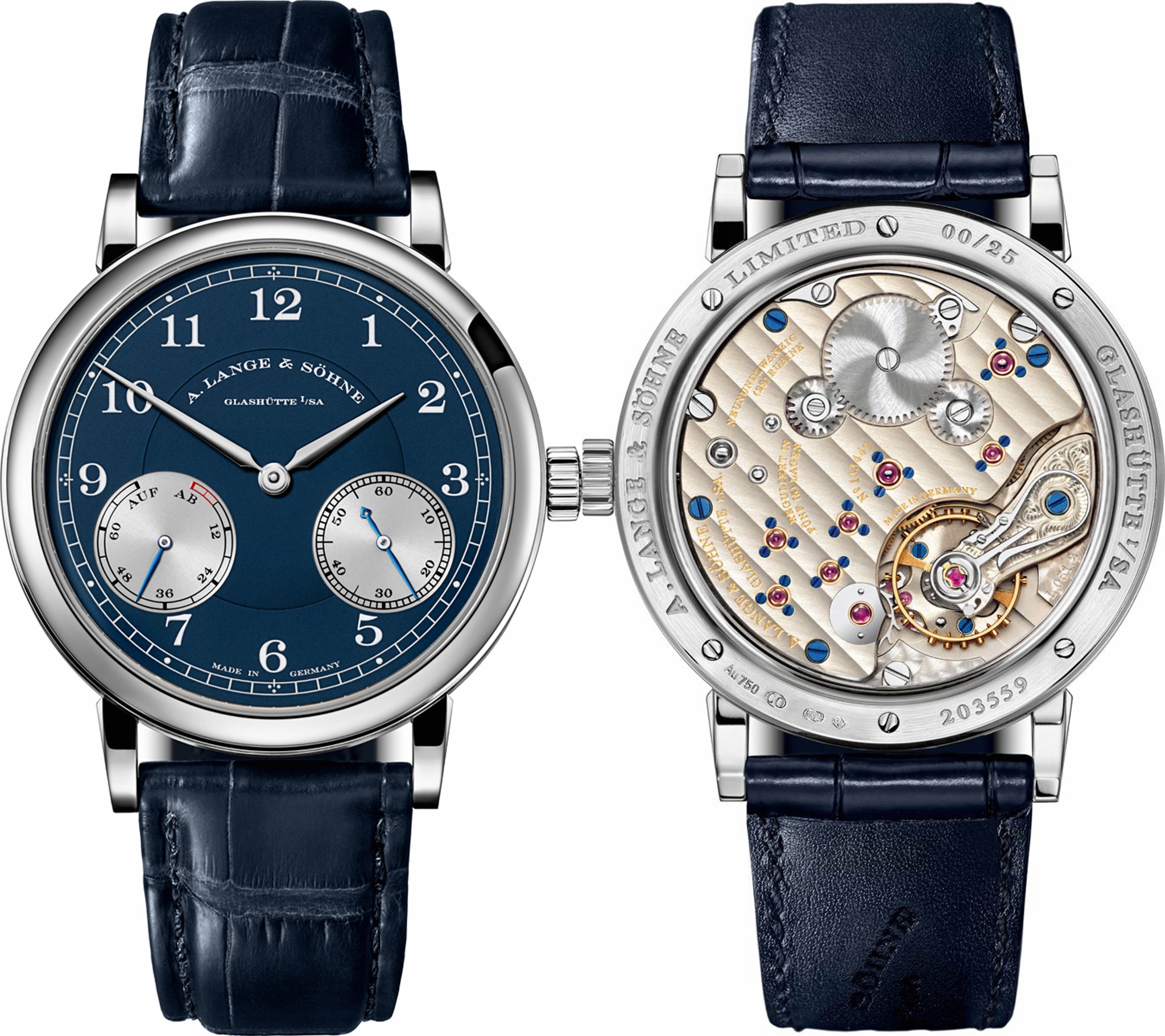 A Lange & Sohne Wempe London boutique 1815 up down with Blue dial.