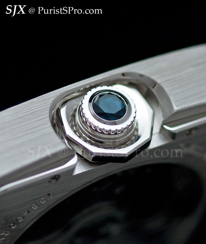 Requiring a bit of explanation is the crown. Inspired by the wheel of a Tank, the crown is a kind of double crown. The centre portion with the sapphire cabochon can be pulled out to set the time and date, but larger, outer crown can wind the watch.