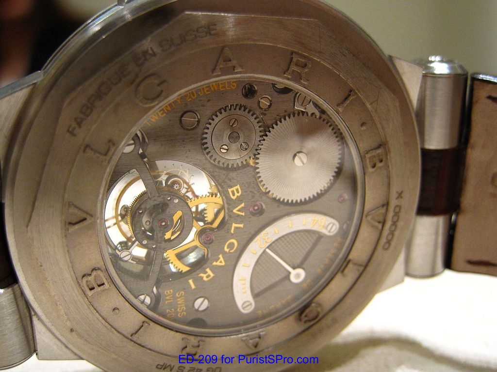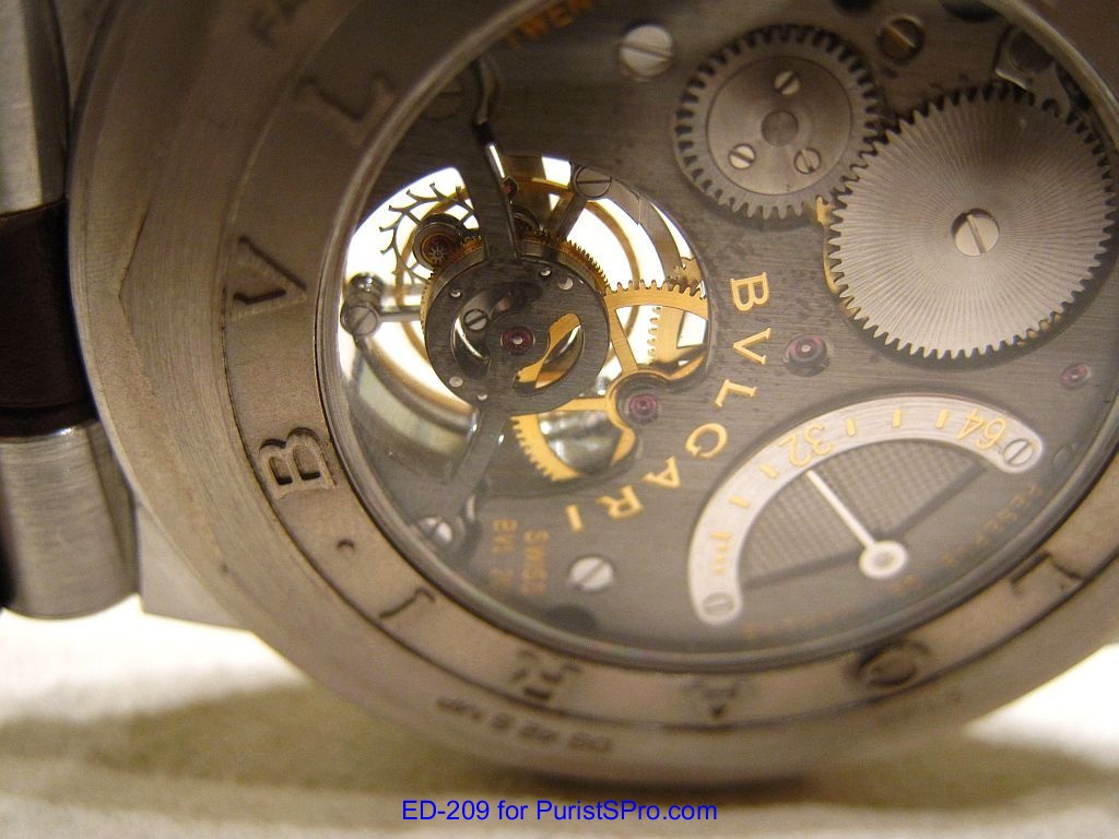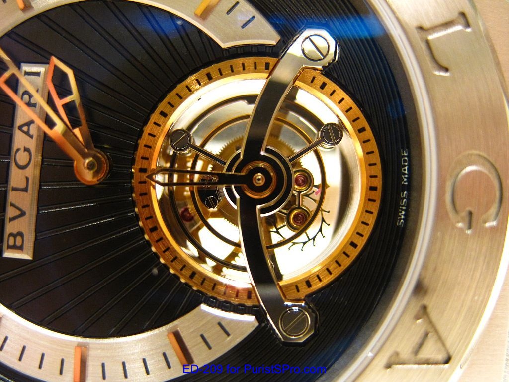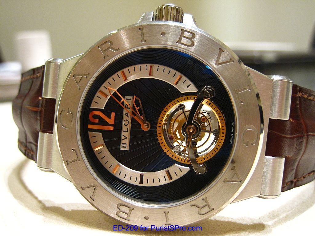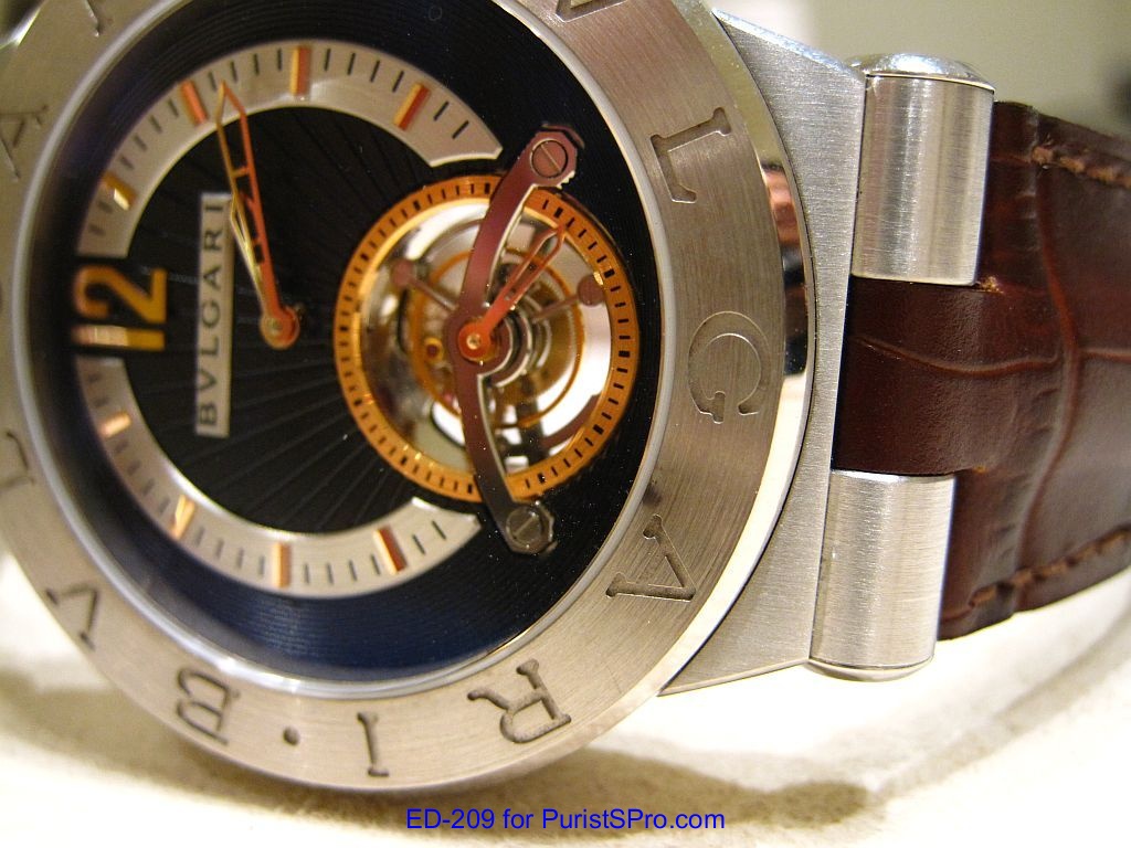 The Bulgari watch collection encompasses a wide range of tourbillons including the Octo Tourbillon Retro, Daniel Roth Tourbillon 8 Jours, Sotirio Tourbillon Perpetual, and my personal favorite the futuristic looking Gerald Genta Toubillon Sapphire. During my recent visit to the Bulgari Boutique in Las Vegas, I had a chance to handle another tourbillon: The Bulgari Diagono Tourbillon in platinum. I have to admit that I tend to gravitate towards the more sporty looking watches but the elegant lines and heavy weight felt on the wrist of the Diagono Tourbillon made me take a second look.