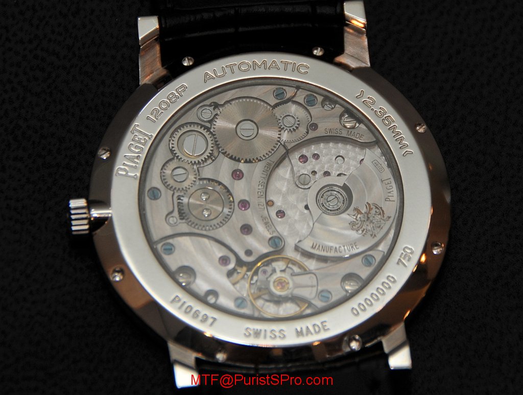 For Piaget, 2010 A.D. will represent a tribute to their rich watchmaking heritage as well as a horological leap towards the future. To celebrate the 50th anniversary of the introduction of its legendary world’s thinnest mechanical self-winding movement (at that time); Calibre 12P in 1960, the Manufacture de Haute Horlogerie Piaget is presenting Calibre 1208P. This new mechanism once again is the thinnest self-winding movement currently on the market, at 2.35 mm. A first record. That's only the thickness of 2 compact discs!