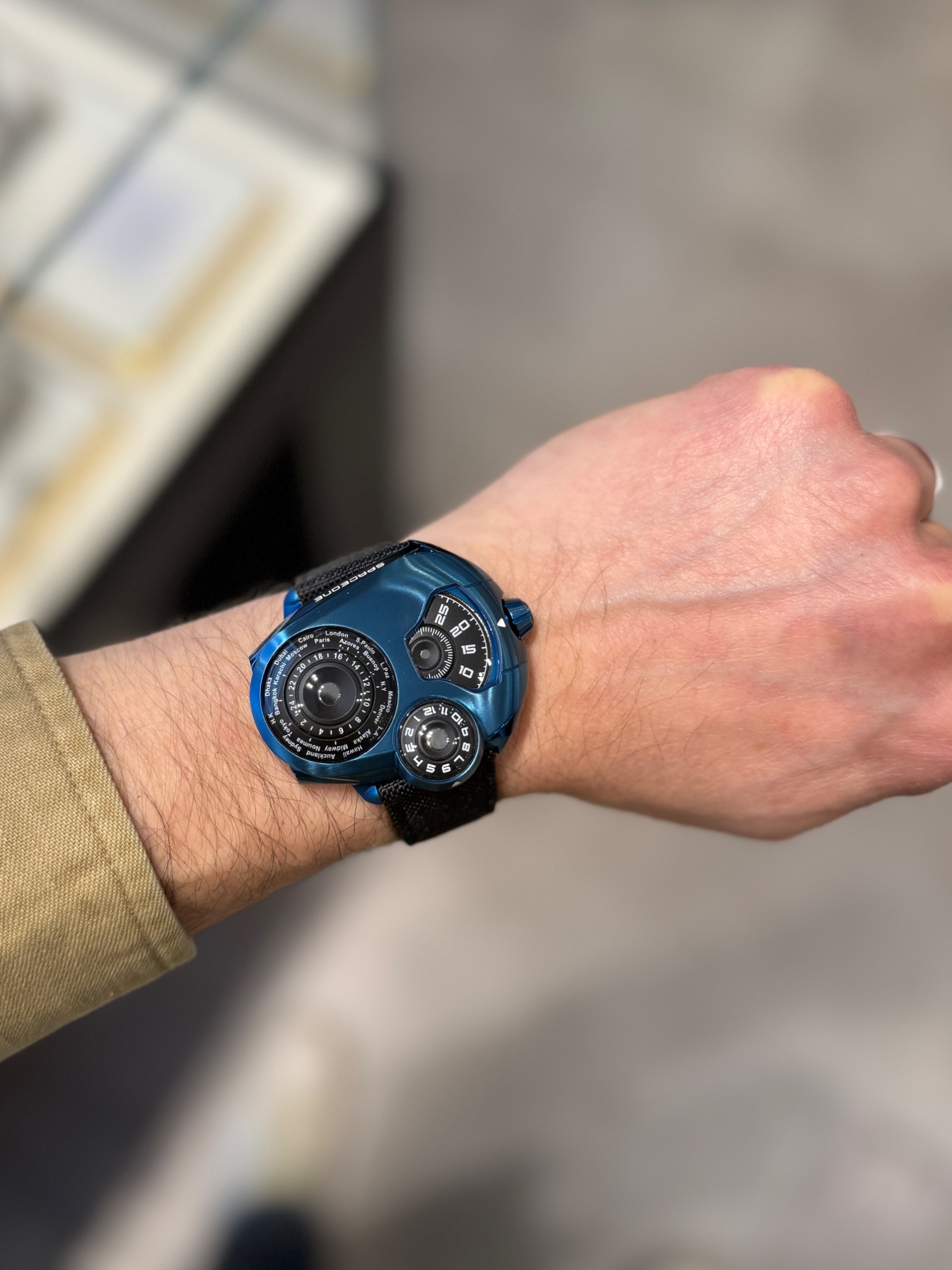 By contrast to the Jumping Hour above the Worldtime which was titanium felt nice and balanced and sat well on my wrist.