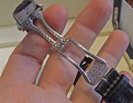 the strap is leather carbon fibre style and comes with a push button deployment clasp. amazingly the unseen bits of the clasp have engine turning detail. this is totally unnessesary but a nice touch.