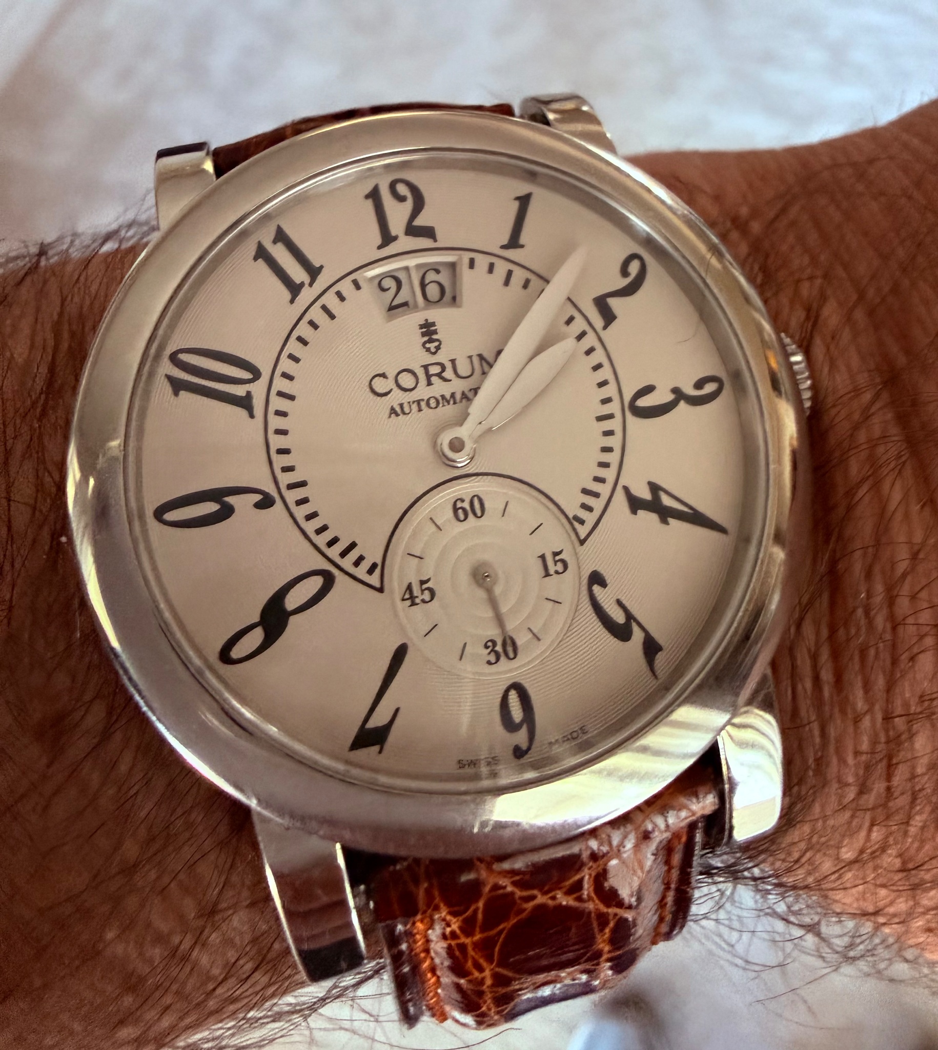 This watch was my father’s. I haven’t taken it out of the safe for at least ten years. If you’re into art deco, it’s pretty cool. 42mm, Reference 922.201.20. Corum isn’t discussed much, but they’ve made some nice and quality watches over the years. Both photos are the same watch in different light.