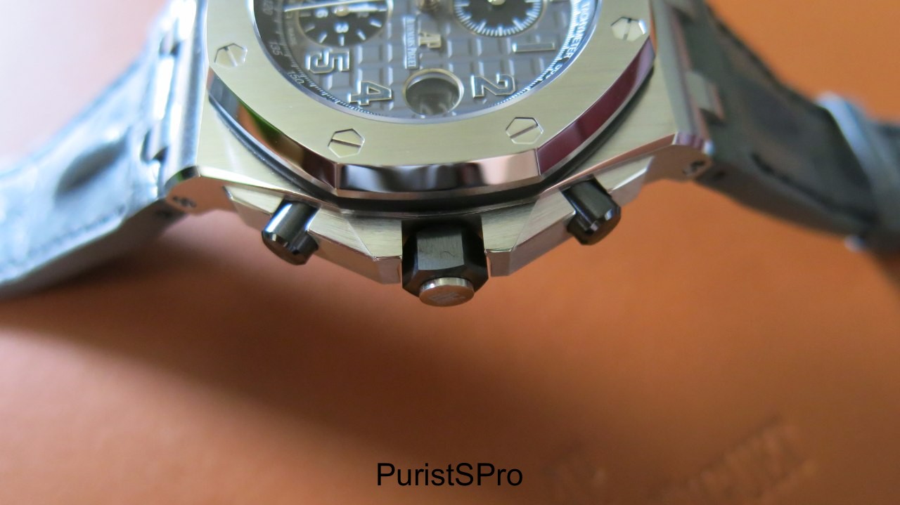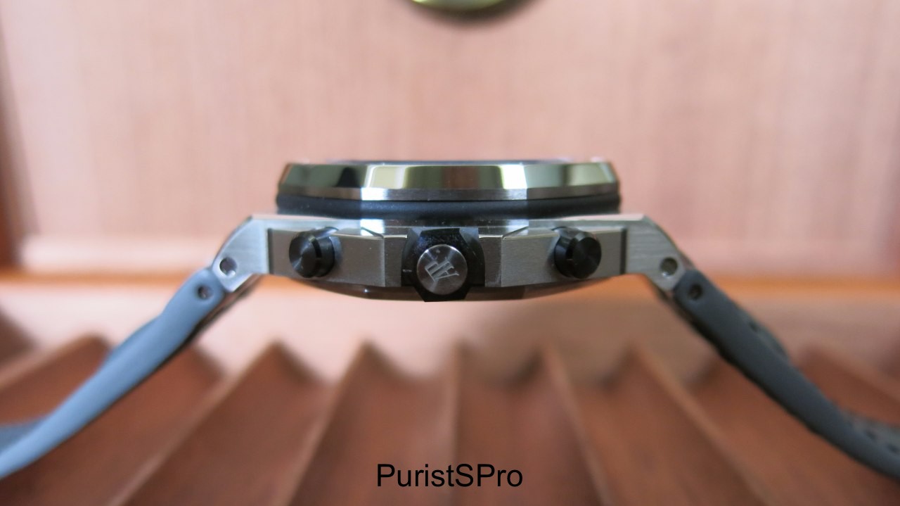 I have purposely saved the most important evolution of this 42mm Royal Oak Offshore for last: the new black ceramic crown, pushers, and guard design.