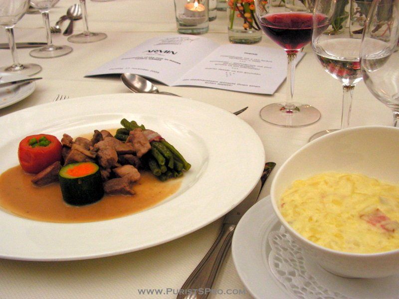 The main course, geschnitzeltes with mushrooms, garden vegetables and a delicious potato preparation that I have never eaten before on the right (Dürsrüttihärdöpfu .. jeh!).
