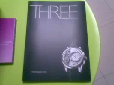 this evening, Singapore JLC boutique had organized an exclusive preview for a small group of JLC fans here to have the first look at three new JLC watches that were just recently launched in SIHH2010 Geneva. i was so lucky to be able to present there and see these great watches at one evening. of course i know you would ask me which of these three watches were bought to Singapore this time, they are Master Compressor Extrem Lab 2, Duomètre à Quantième Lunaire, and Master Memovox International in SS. was only able to photos of these watches posted by Nico, i am happy to try all these watches on my wrist finally!!! my impression on these watches are: 1. LAB2 is no doubt a super and functional watch, in fact it is impressed by me very much because although it is composited by 500+ parts inside the watch and the size is pretty large for me (i remember it is about 46mm but forgot the thickness), when you tried on your wrist, you won't feel heavy at all which may be because of new materials made. 2. Duomètre is also a very nice and elegant watch as usual. the dial is well-design and well-balance although parts of dial are opened. the moon phase is nicely designed. i saw some of sky painted in red. last but of least, the 1/6 second hand is just lovely, i am sure if my son has a chance to see it, he will like it too. 3. Memovox International still can maintain his classic look, international city names painted in while were nicely contrasted with the black dial. compared with LAB2 and Duomètre, i prefer this memovox may be partly because of its right size for me which is 40mm in diameter. i tried it on my wrist, it fits to my small wrist perfectly. few of us tried to wind the alarm and listened the sound. i haven't had a chance to listen alarm sound from old memovox, can't make comparison between this new one and old one. but this new one, the alarm sound was quite clear and loud. i didn't bring my camera to take pics to show you guys here. i am sure all these wonderful watches are traveling around the world. probably next stop will be your place soon. as told, after this stop in Singapore, next stop will be in HK soon. hose friends in HK, beware of this preview to be held in HK soon. last but not least, after the evening everyone of us was received a door gift by the boutique staff. you guess what, it is "THREE: YEARBOOK 2010". I am very happy to have one with me. just used my mobile phone to take pics to show you guys. hope you enjoy my brief and quick report. stefan