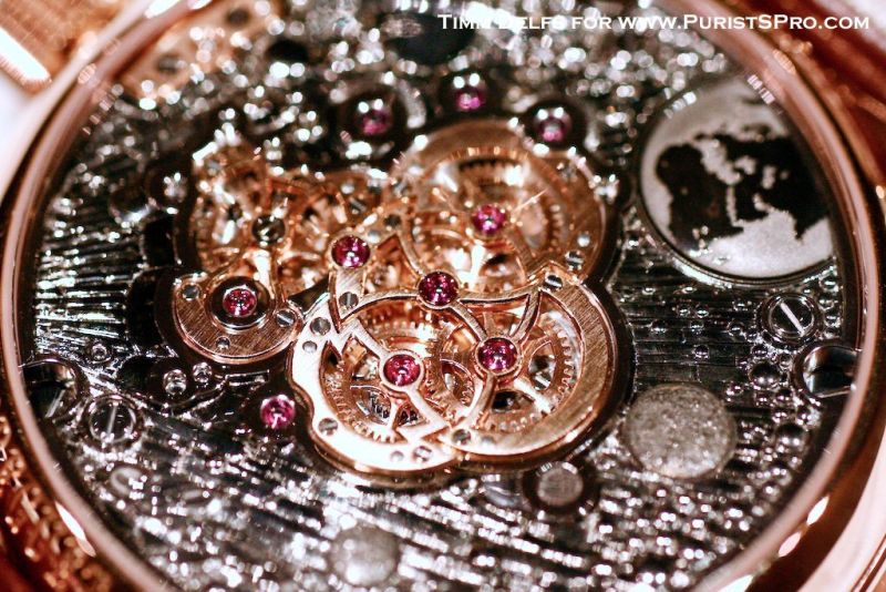 The Classique Double Tourbillon with its engraved rendering of the planets on the back is now available in rose gold.  The two tourbillons that orbit the guilloché dial are linked to the rest of the gear train via a differential that averages the rate of the two tourbillons.