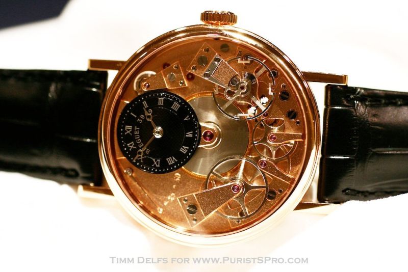 Breguet is one of the brands that don't announce their novelties using all sorts of superlatives.  This year, furthermore, was dedicated to slight modifications in existing models.  Thus, for example, the first model of the "Tradition" was shown in two new versions, one in white gold, the other one in rose gold.  The most noteable difference consists in the guilloché gold dial that has been covered with a black coating as opposed to the silvered one of the original.