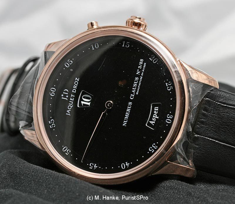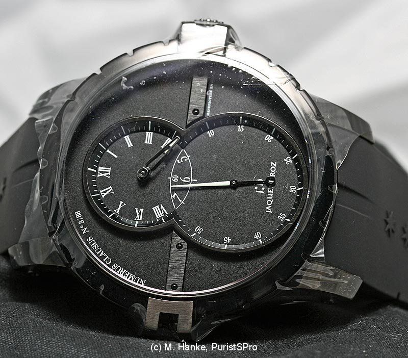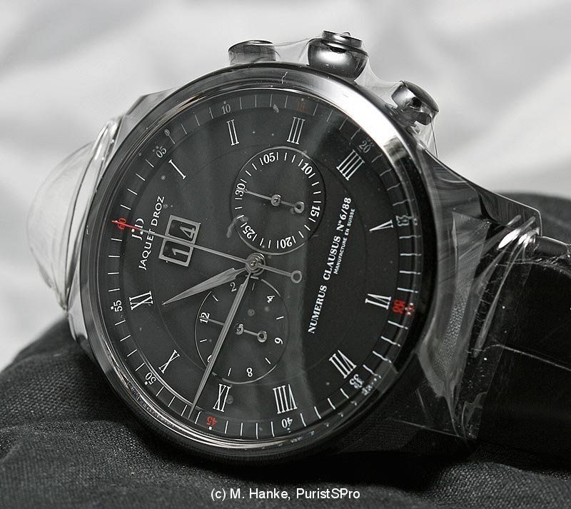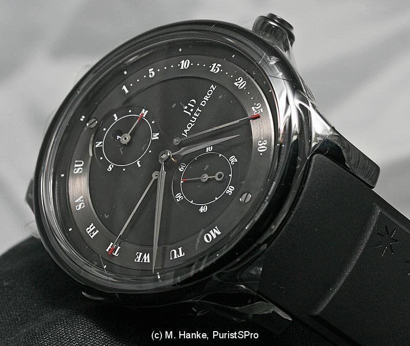 Next one is a very attractive variant of the well known JD perpetual calendar. Following the current fashion, this one is black overall, but with typical JD-style care for details. The case is made from black ceramic, and the hands are coated with black gold. The dial is black opaline.
