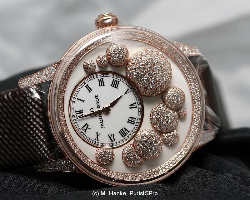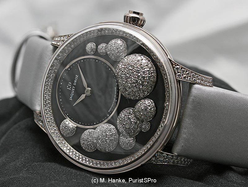 A bubbly feeling arises when looking at the "Heure Celeste": Around the eccentric time display, several spheres are rising from the surface, set with diamonds of various colours, or gold-coated. The nicest effect is seen when looked at the watch from the side.