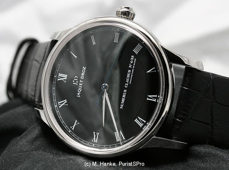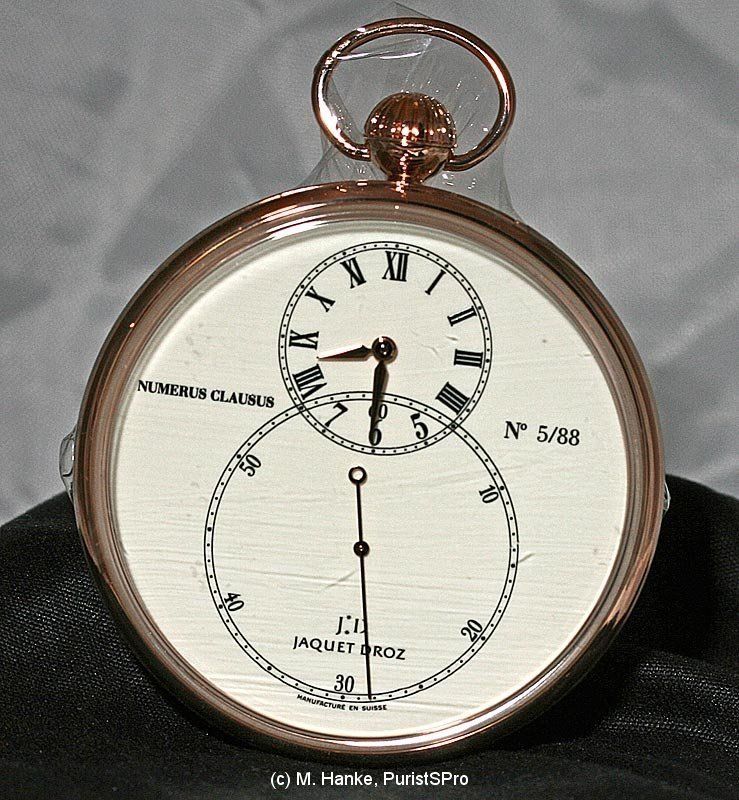 Finally? But no, there is one other novelty, and this one is my personal 2009 Jaquet Droz favourite: Called "L'Origine Email", this watch is JD's concession to a more difficult economic situation. The "L'Origine" is simply a simple beauty, a watch without any ornaments or complications, but the concentrate of Jaquet Droz' virtues. The finely finished Piguet selfwinding movement powers a watch with only three hands, hour, minute and a big central sweep second. The case material is limited to stainless steel, with a diameter of 43mm. Dials are in either ivory or black plain enamel, limited to 88 pieces each. Hands are in white gold or blued steel. This watch is offered at a price that is far outside the level JD watches normally are positioned in: 9,990 Swiss Franks. For me, this is one of the most beautiful watches I have seen at the entire fair, and I am heavily thinking about acquiring one.