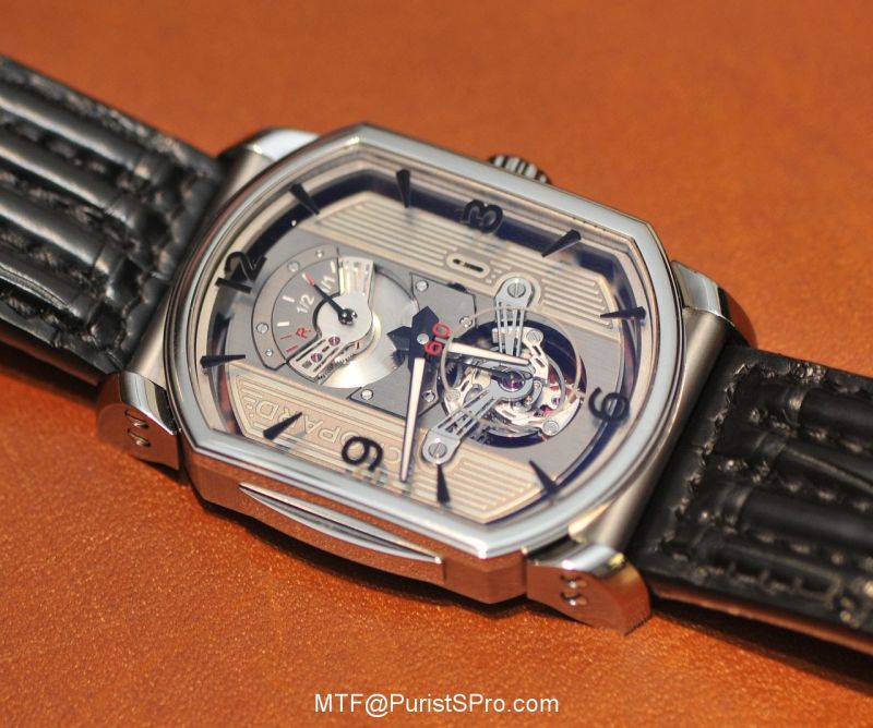 The sapphire crystal, front and back, evoke the inspection windows of a race car. I almost expected to see 48 racing cams whizzing along under the hood. The Tourbillon Reserve Marche TRM meter looks like a fuel gauge at 12 o’clock but hopefully, it should not be as heavy on consumption as a normal racing engine and the reserves should last 60 hours.