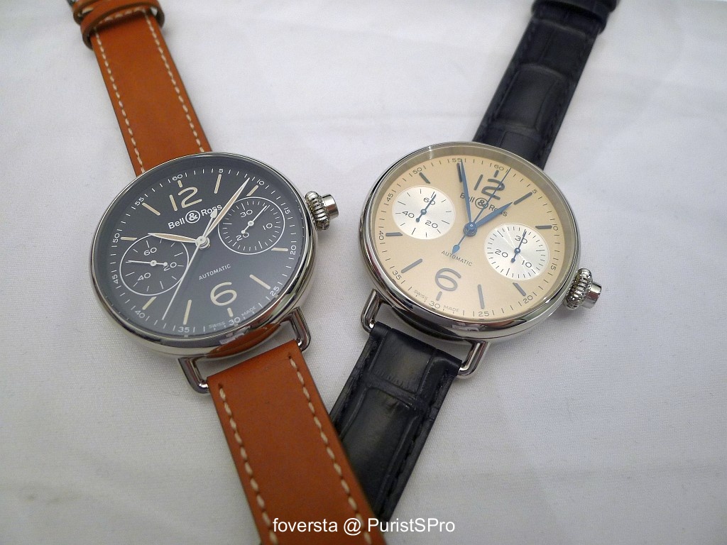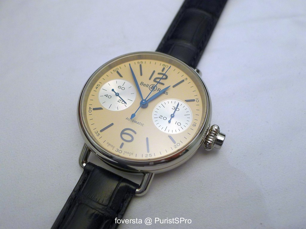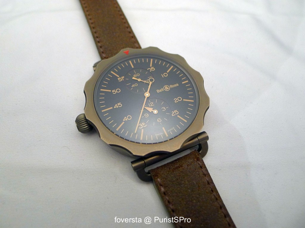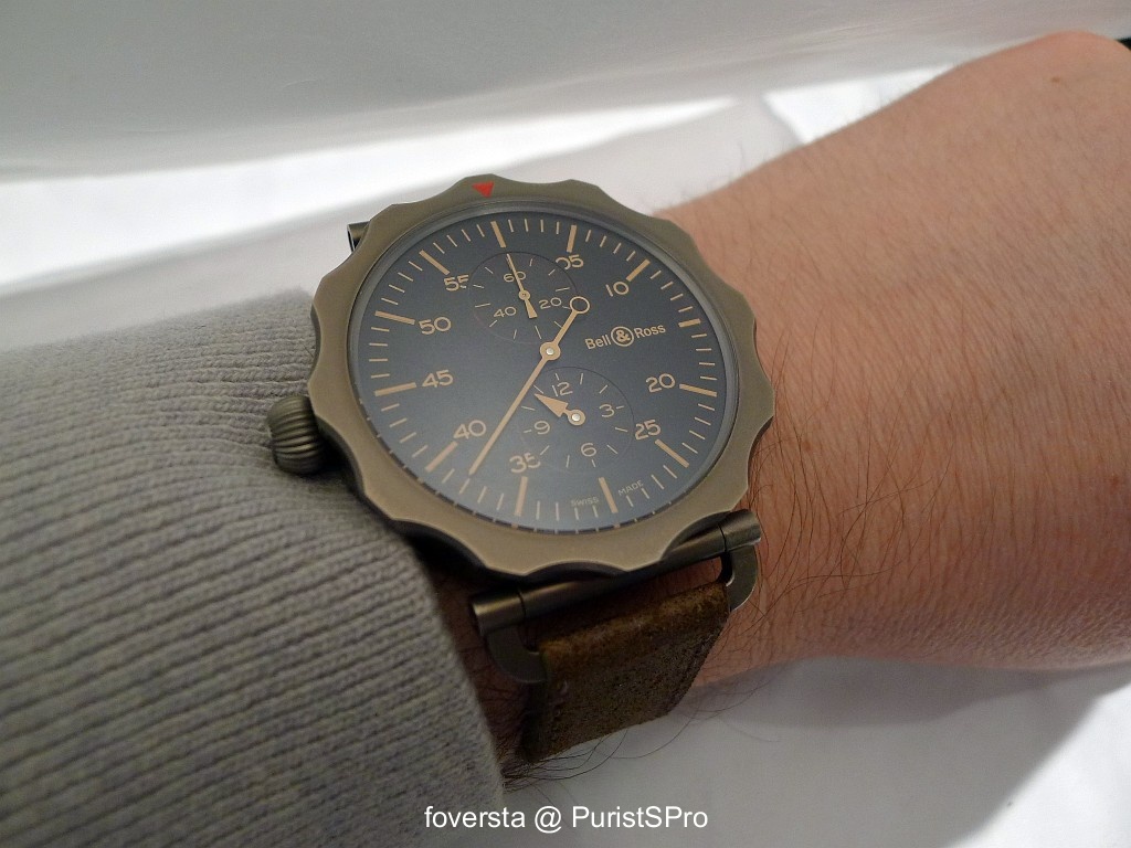 But the star of the show was without any doubt the WW2 Bomber Regulator. This huge (49mm!) watch is inspired by a bomber navigator as we can guess it with the case shape and the dial lay-out. Automatic movement comes (again) from Dubois-Depraz. Bell & Ross designers worked a lot on the details of the WW2 like the grey PVD finish of the case, the sand colored coating of the indexes and figures, the calfskin strap...