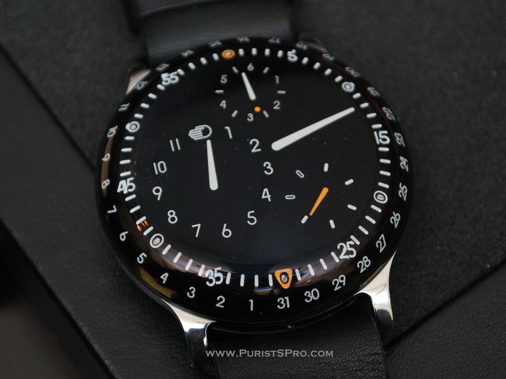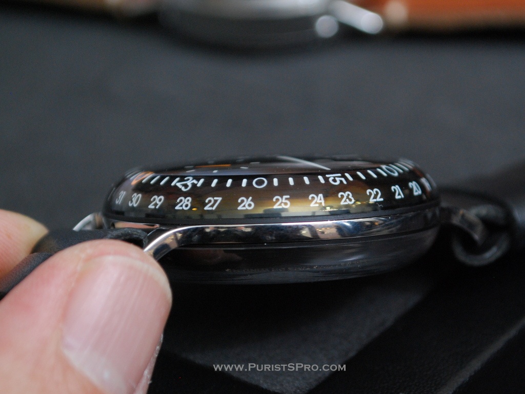 By filling the space between the dial and the crystal with a transparent liquid it appears that the dial is really on the surface of the crystal. The effect is massive and surprising. Once again we see that Mr. Mintiens is an industrial designer by profession and the entire piece is satisfying both in its looks and in its feel in the hand and on the wrist.