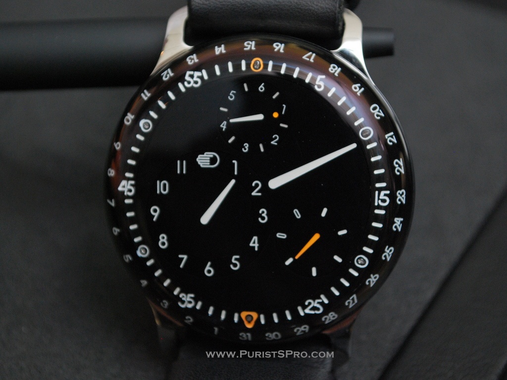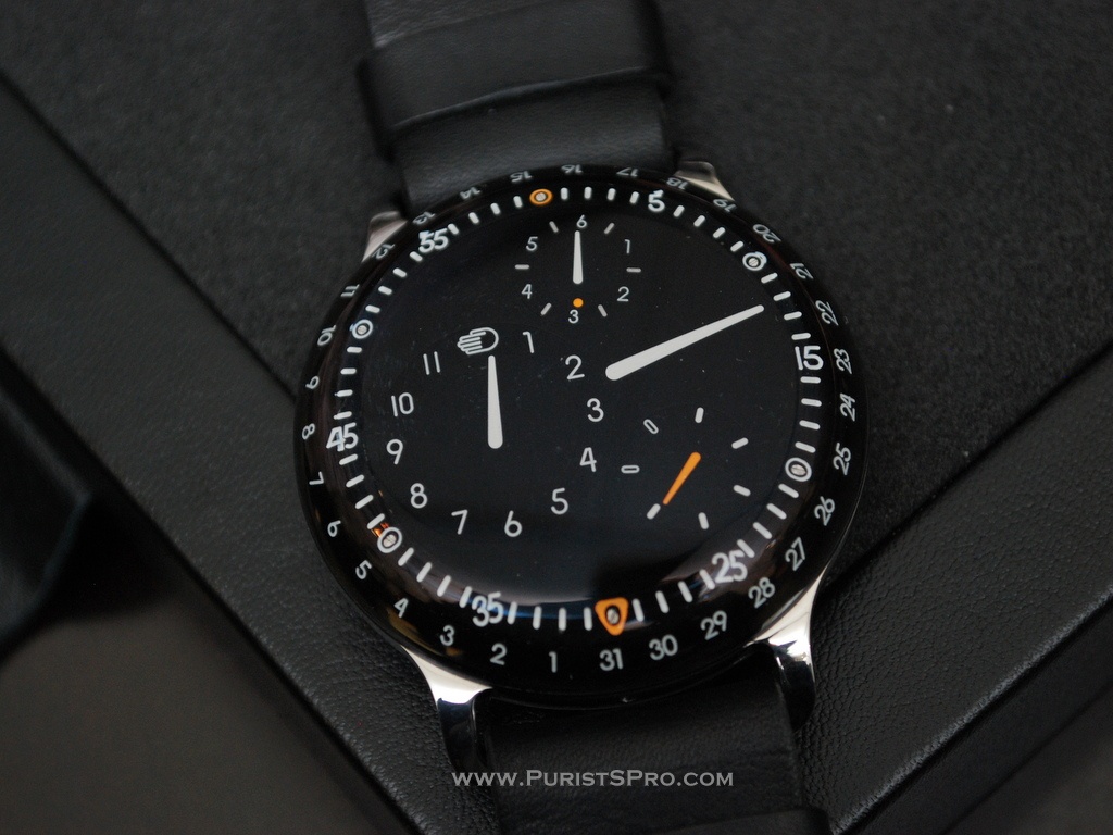One of the things we notice immediately is the lack of a crown on this watch. The entire back of the case takes this function. Depending on the position of the back and whether the dial is facing up or down the watch can be wound (not really necessary, as it is an automatic) and the time and date set.