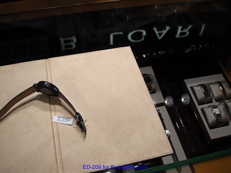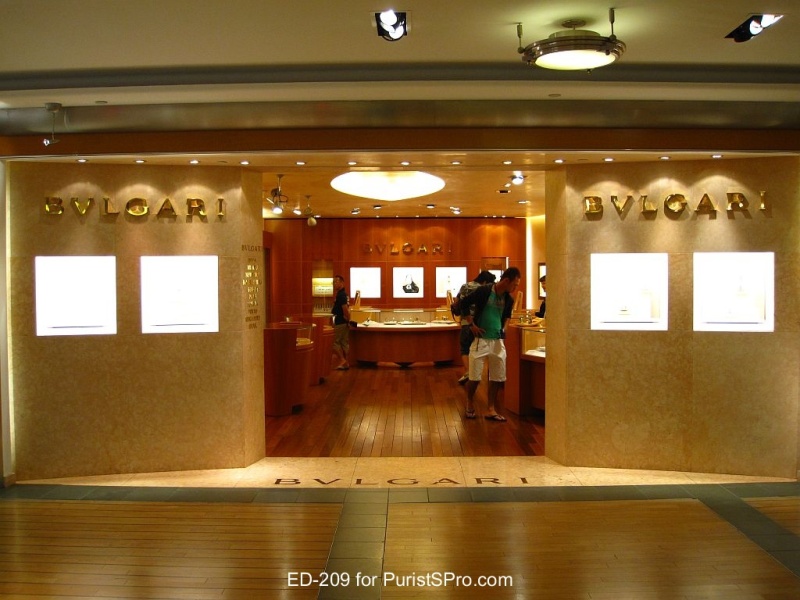 A short walk around the corner of the DFS Gallery is the Luxury Watch section. Many brands are represented here but I was on a quest to see what Bulgari had in stock. Although the watches were displayed in a single long glass case there were quite a large selection of Diagono's, Assioma's, Bulgari-Bulgari, and B.Zero1's. A friendly sales rep was there to answer my questions and the first thing I asked was about the GG/DR collection. He said that they were expecting some soon but did not have a firm date of arrival. He did show me two Sotorios, the retrograde date in YG and another in SS.