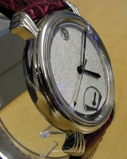 Now we shift to the complications starting with a simple power reserve indication, 0.8mm additional thickness. Note the typical whitened silver dial. These dials are each unique, the pattern engraved by hand.
