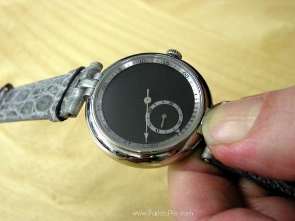 The "Baladin" shows the hours in a turning window on the dial that also points to the minutes on the rim of the face. To avoid the problems of inversed reading of 6 and 9 letters are also used. Here T for three.