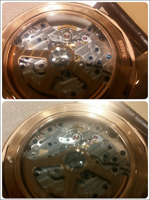 During the JLC True Second launch and prior to collect my Geophysic Universal Time True Second, the sales representative keeps telling me the one I am about to get has a piece missing from the regular production. I was totally baffled to what he was saying until he send me a photo, showing the missing part (top center of photo) and the regular production piece has an additional "bridge" covering partially the swinging balance. He explained that to have the piece added the movement looked "whole", and the launched model doesn't have, making the watch more exclusive. After seeing this photo, what are your thoughts, with or without or doesn't matter?
