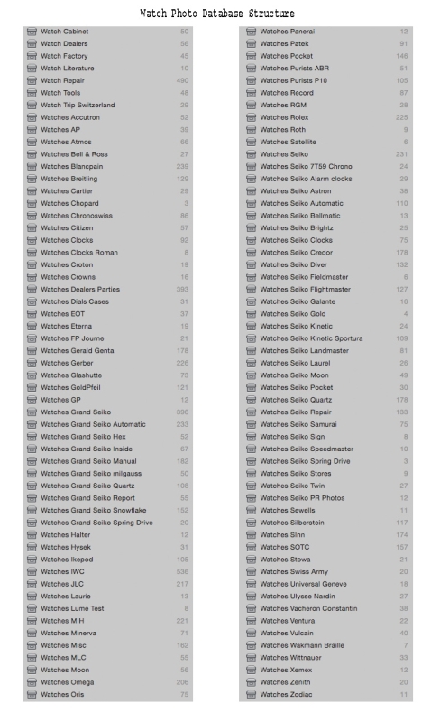 My objective is to be able to find things visually or do word searches (I have dozens of other photo categories, so I included watches in the name of each "project"). I don't really add any data to each image, but rely on my project structure to find things. If I keep the contents of each folder under 500 images, I can visually find what I need in just a few seconds. Except when I want something like Jonathan's Uwerk -- that took some searching. I guess I need a new folder called Watches of Friends.