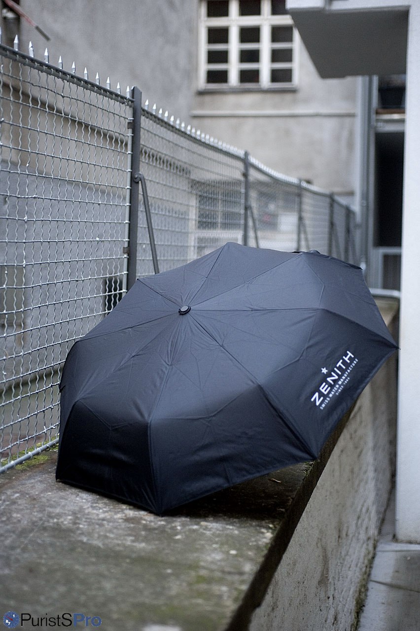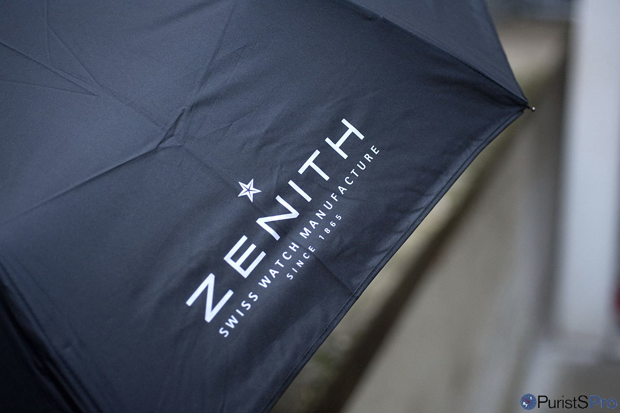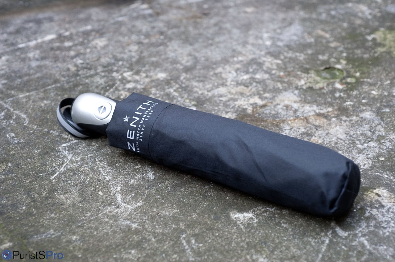 Zenith branded umbrella. Made of black textile with a printed Zenith logo, is opens automatically and also closes, at least in part, by actuation of the knob in the handle. Just like start & stop of a monopusher chronograph... A Zenith gift of practical value for the entire family! Again, contact your AD or your Zenith boutique.