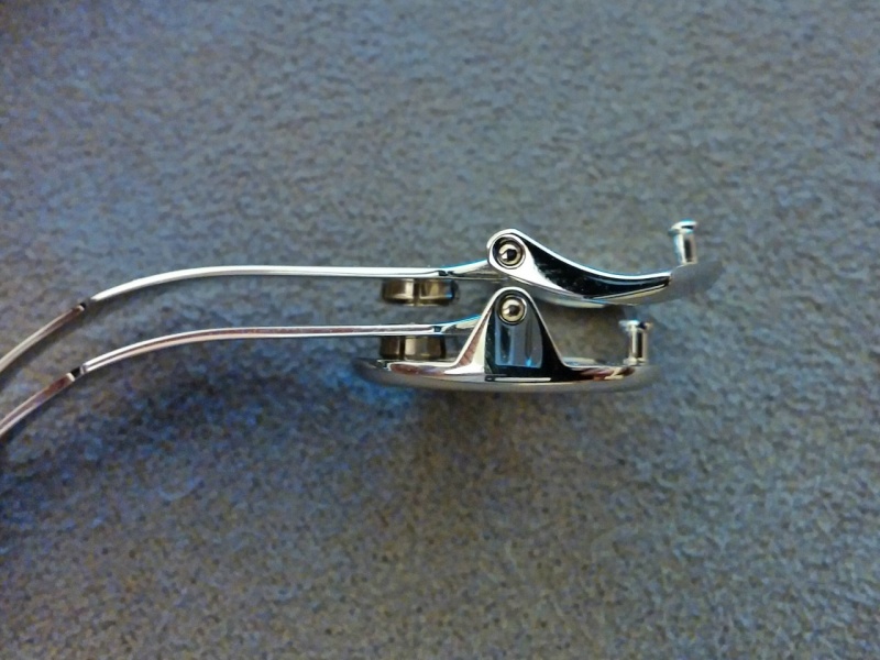 Notice that the pin of the chevron style deployant sits farther out than that of the calatrava buckle! This works to about 1/2 distance between the pin holes in the strap. So, what I found is that experimenting between the two buckles, I can fine-tune the "sweet spot" of strap length for my watch.