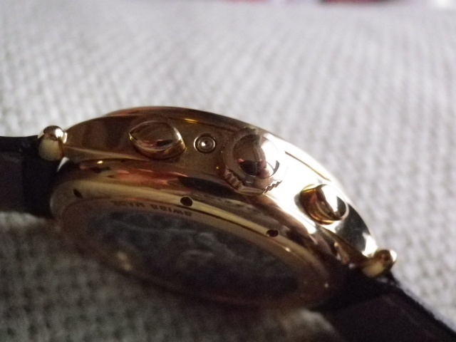 The action of the chronograph is crisp. The feeling is between the "hard click" you would feel on my PP 5980 (or that of any ETA7750, for that matter) and the butter-like feel of the Lange chronos (sorry for the layman description, not a great technical expert here). I would say it is "sensuous and enjoyable". The reset button feels as if nothing was there, not even butter, as you practically notice no resistance when you push it. Wonderful.