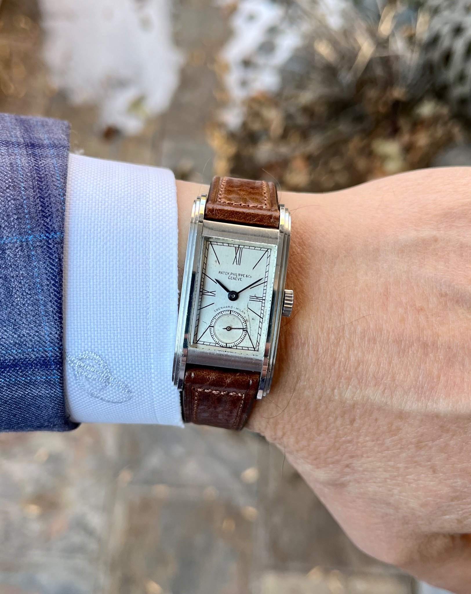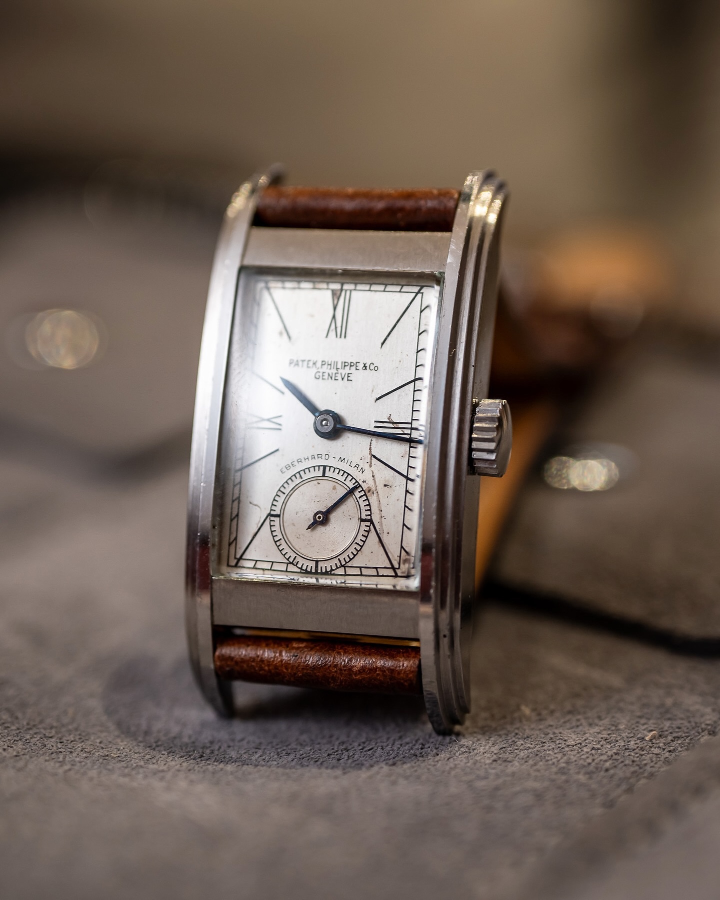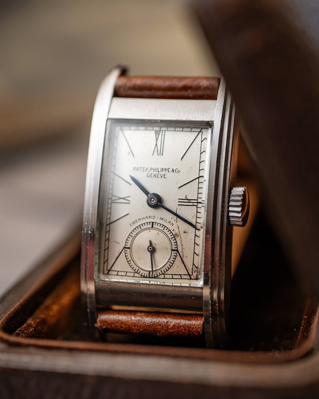 “This was a watch that was gifted to a family in Italy, a famous composer’s family. His name was Giuseppe Verdi. It was in the family from around 1939 until the present. And it was brought to market by another member of the family. The individual who got it contacted me. They knew my tastes. So I ended up buying it very early this past year. It’s one of only seven in the world known in steel. And the thing that makes it unique is it’s also unrestored. The other six have had some level of restoration done. And it’s hard to see with my eyes, but it says ‘Eberhard Milan’ on the dial, which was a retailer at the time in Italy. The backside of it is interesting, too, because it’s got an inscription from the royal family. The belief is that it was gifted by King Umberto, one of the last kings of Italy, to that family, and stayed in the family’s possession for that whole time. So it’s got the combination of rarity, condition from the standpoint of never being restored, and the provenance that, to me, makes it really a very interesting watch.”