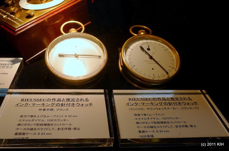 Sorry for the bad lighting - those two are presumed to be by Rieussec: Pocket watches with ink-marking hands.